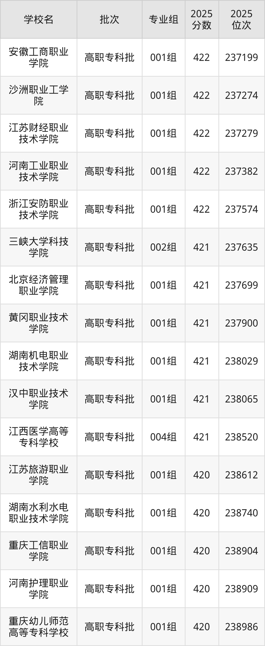 2025年安徽高考物理类421分(237610名~238608名)能上的大学有北京经济管理职业学院001组、汉中职业技术学院001组、湖南机电职业技术学院001组、黄冈职业技术学院001组等。