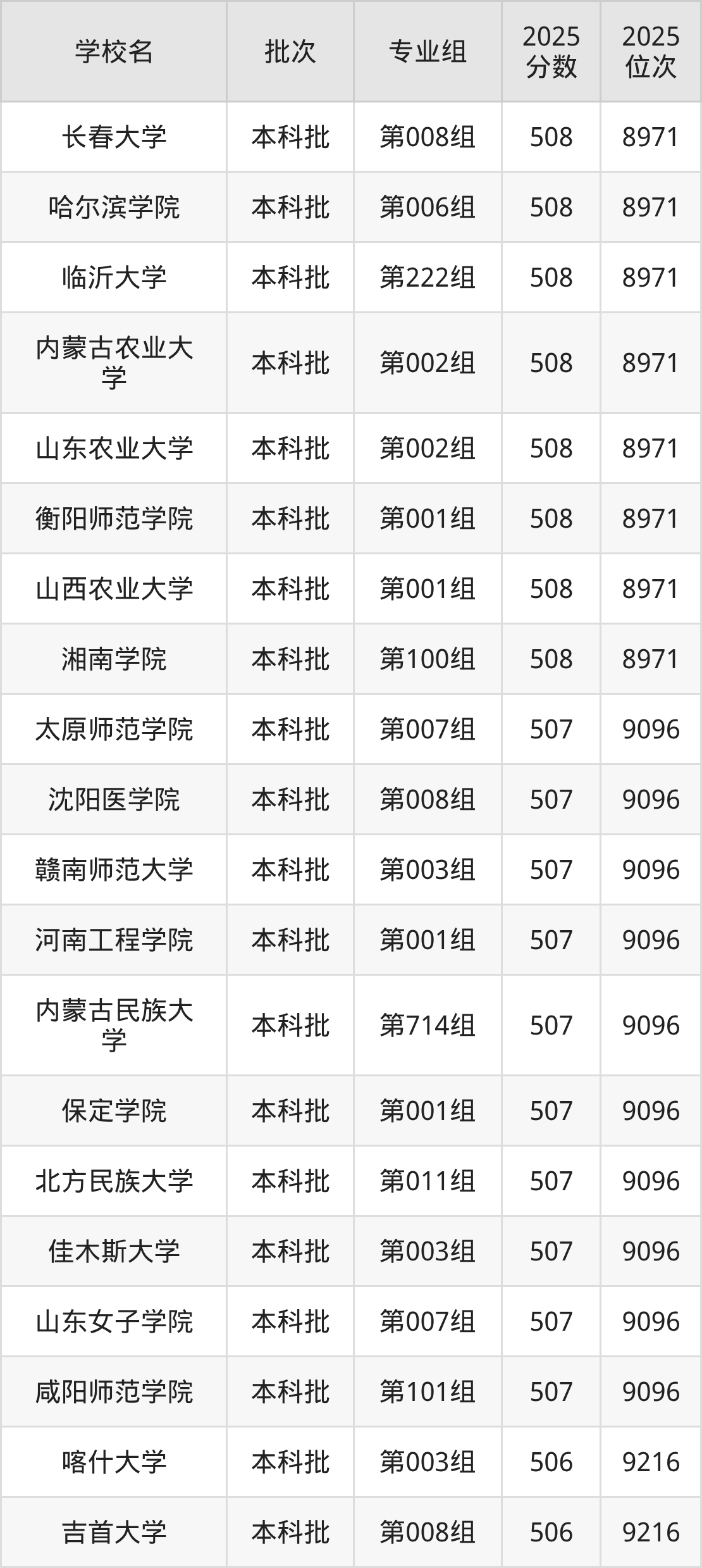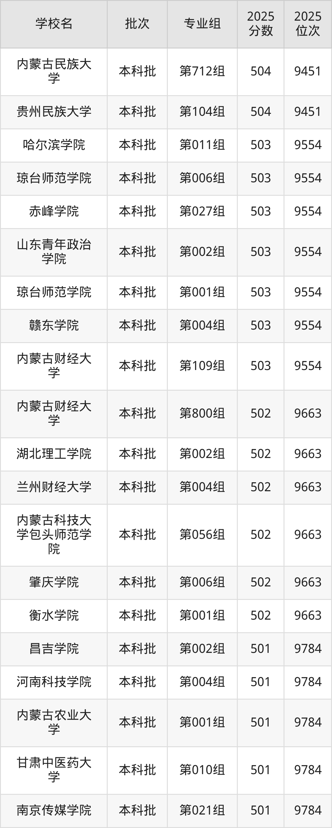 2025年内蒙古高考历史类503分(9452名~9554名)能上的大学有赤峰学院第027组、哈尔滨学院第011组、内蒙古财经大学第109组、赣东学院第004组等。