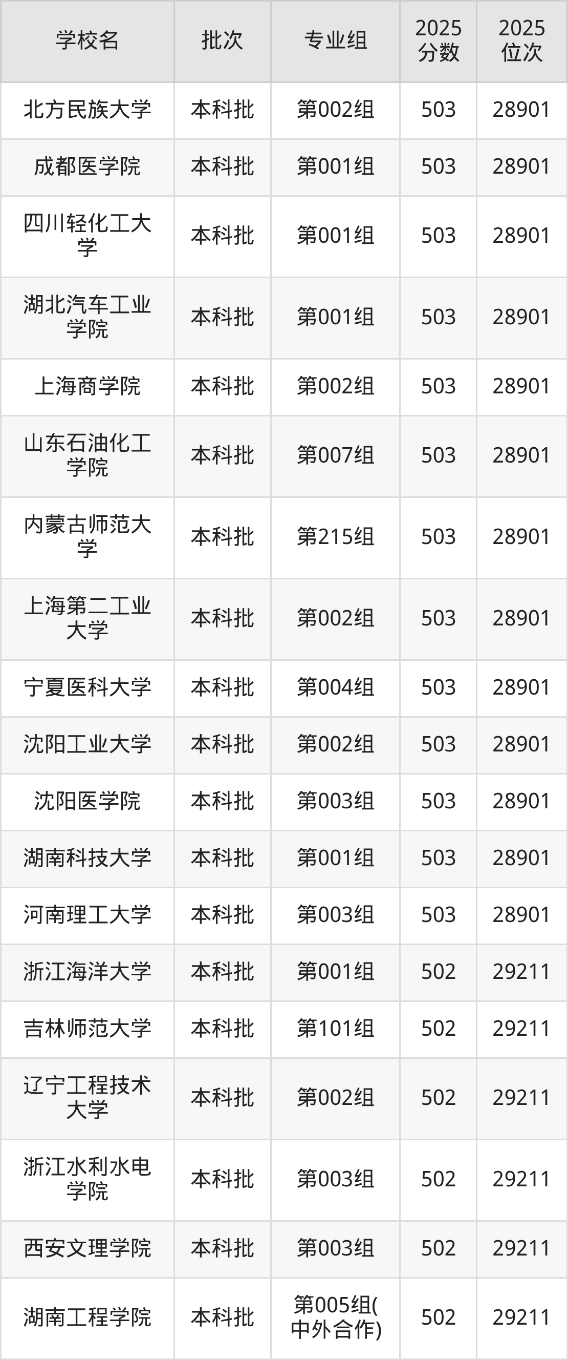 2025年内蒙古高考物理类503分(28646名~28901名)能上的大学有上海第二工业大学第002组、沈阳医学院第003组、湖北汽车工业学院第001组、内蒙古师范大学第215组等。