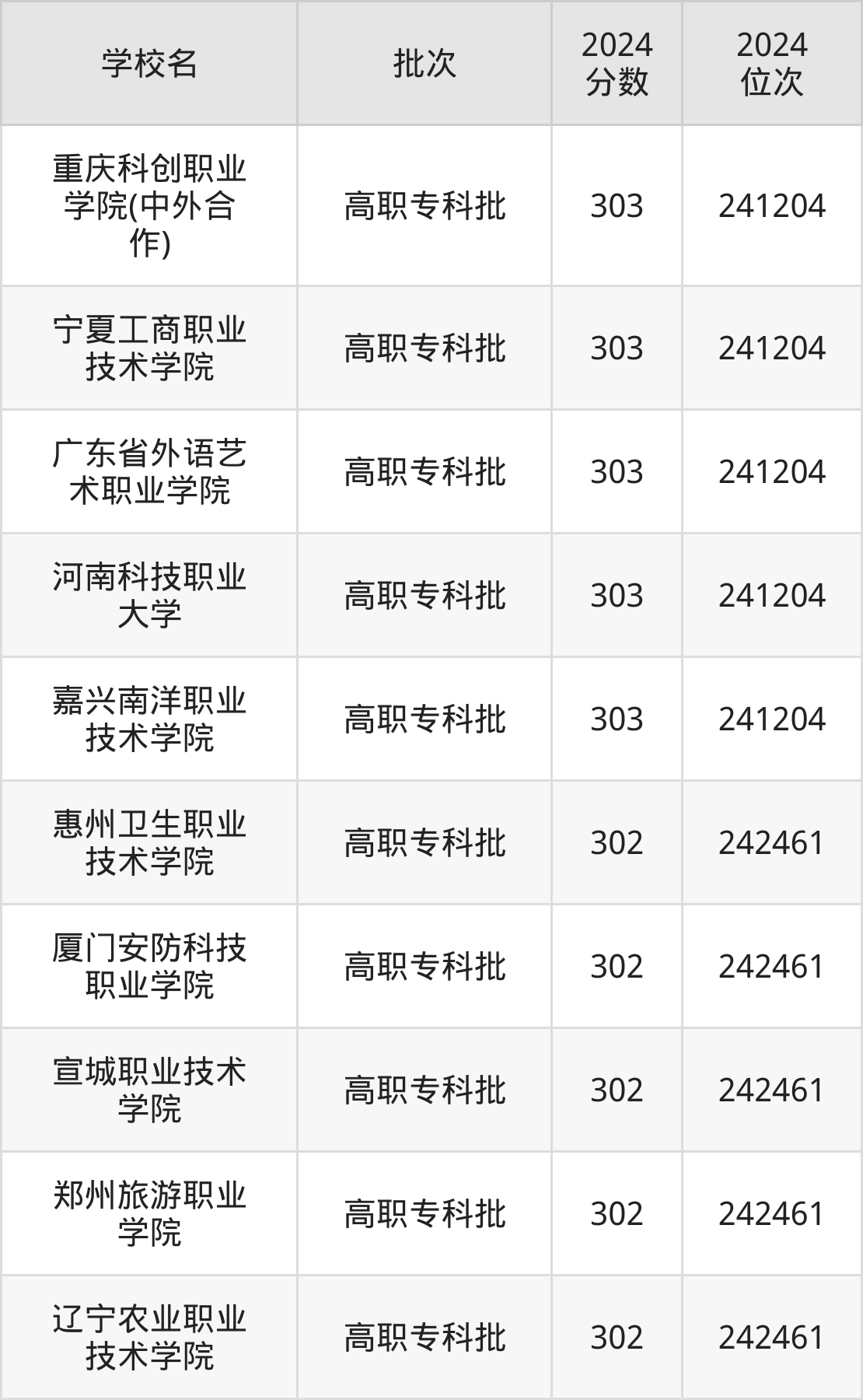 2024年河南高考文科302分(241205名~242461名)能上的大学有辽宁农业职业技术学院、郑州旅游职业学院、宣城职业技术学院、厦门安防科技职业学院等。
