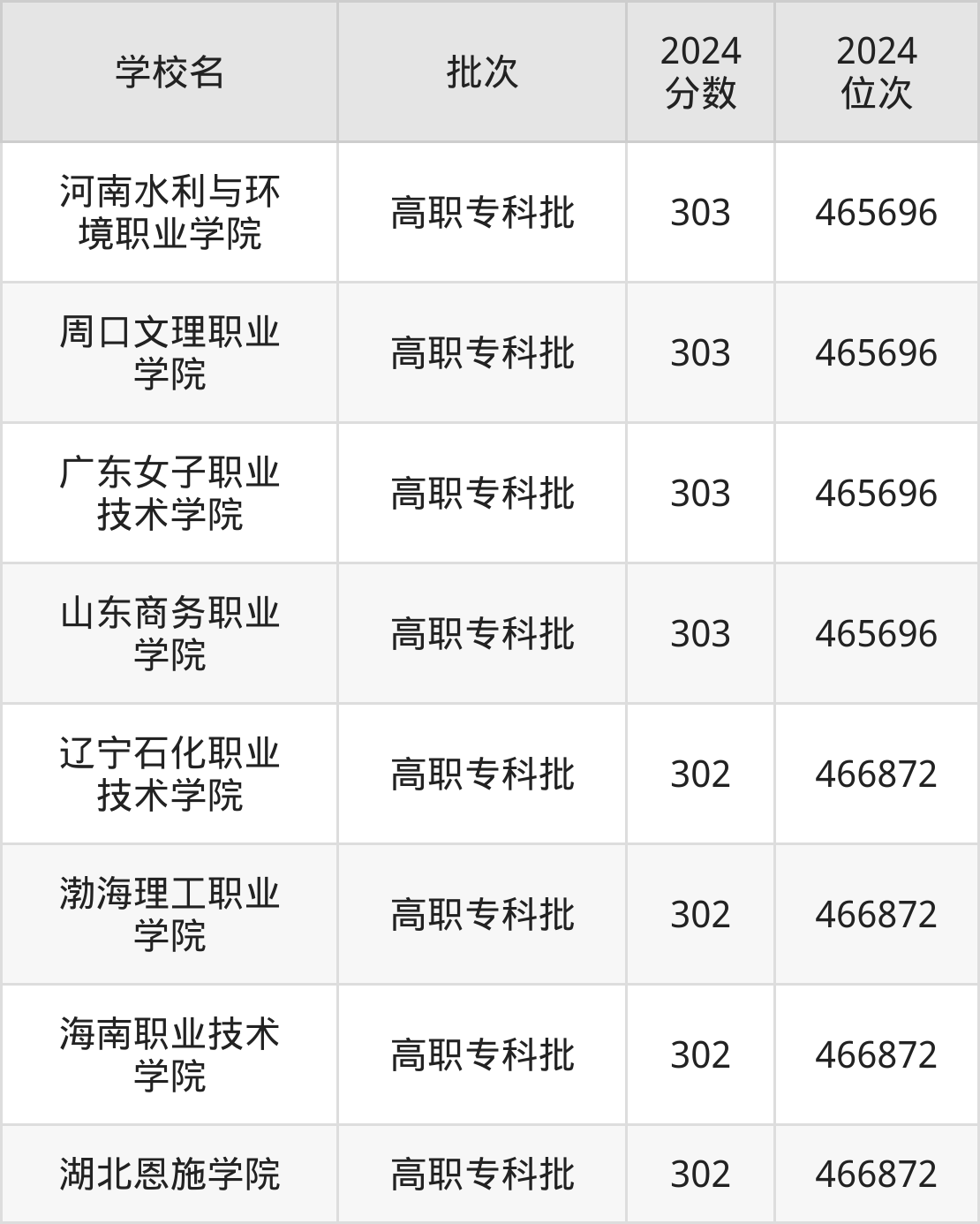 2024年河南高考理科302分(465698名~466873名)能上的大学有湖北恩施学院、辽宁石化职业技术学院、渤海理工职业学院、海南职业技术学院。