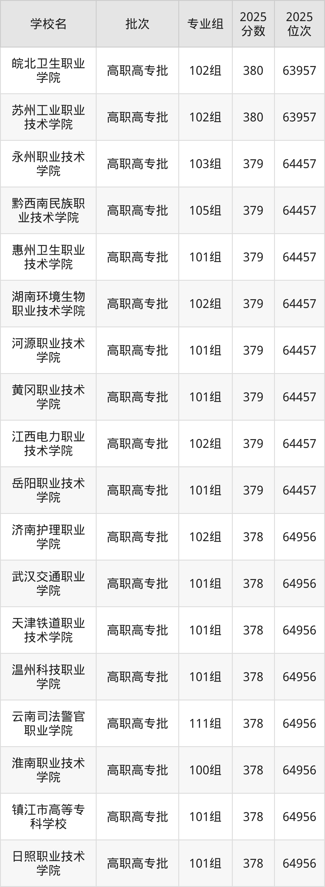 2025年广西高考历史类378分(64458名~64956名)能上的大学有镇江市高等专科学校101组、日照职业技术学院101组、淮南职业技术学院100组、云南司法警官职业学院111组等。