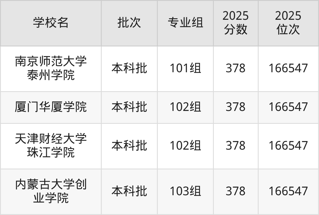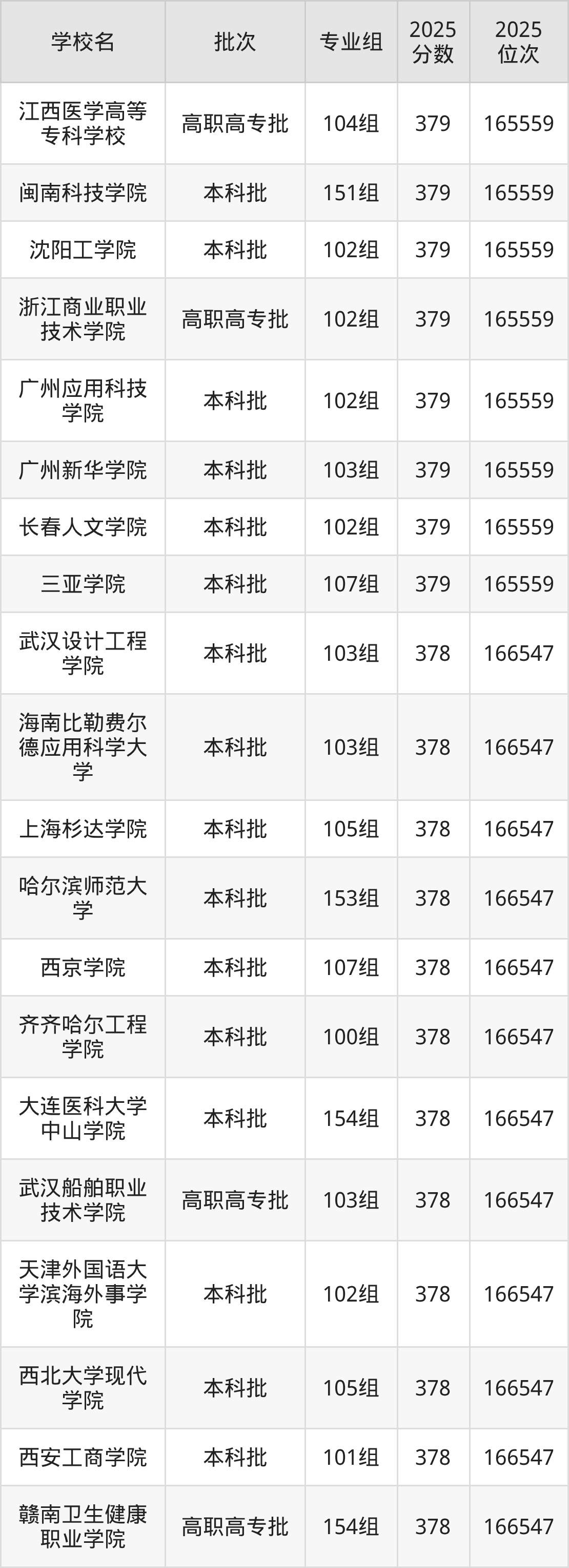2025年广西高考物理类378分(165560名~166547名)能上的大学有哈尔滨师范大学153组、上海杉达学院105组、厦门华厦学院102组、西京学院107组等。