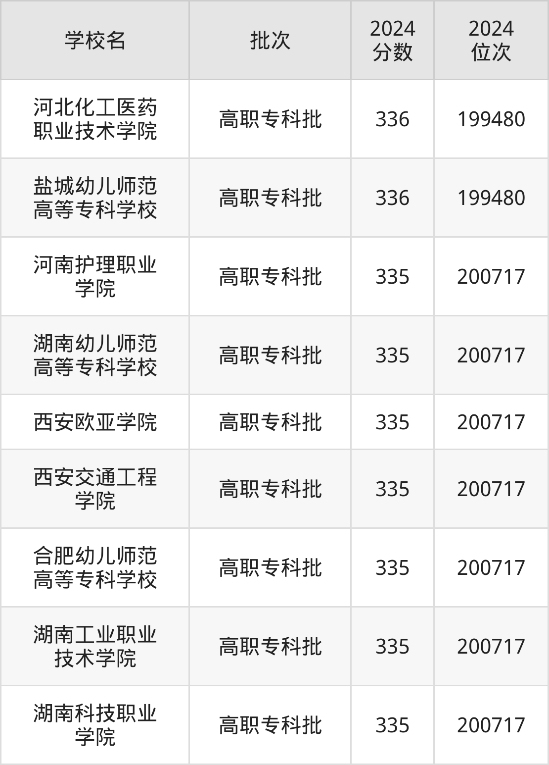 2024年河南高考文科335分(199481名~200717名)能上的大学有西安欧亚学院、西安交通工程学院、湖南科技职业学院、合肥幼儿师范高等专科学校等。