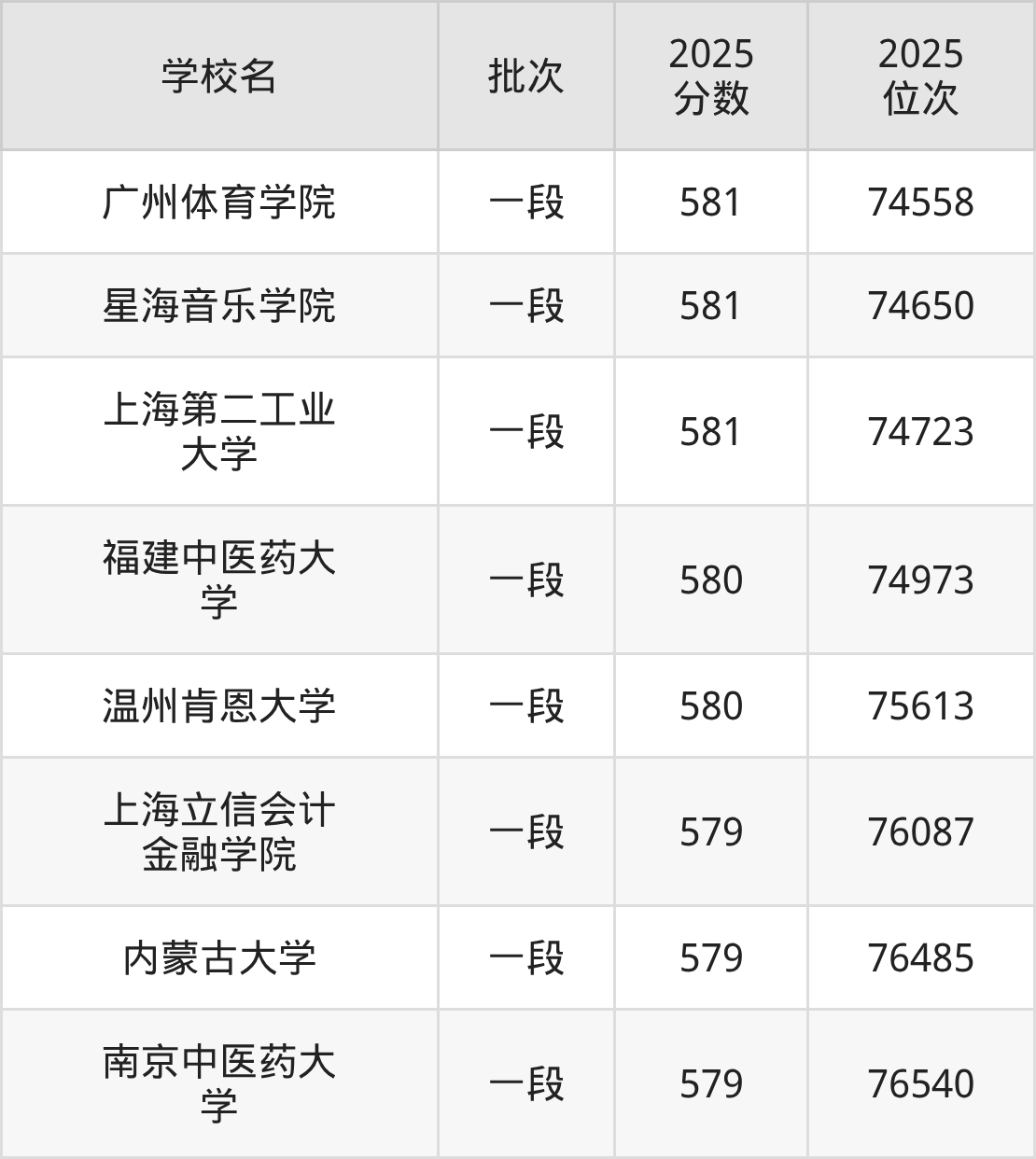 这些都是2026年高考74835名~76084名考生可以报考的大学,更多学校名单如下表所示: