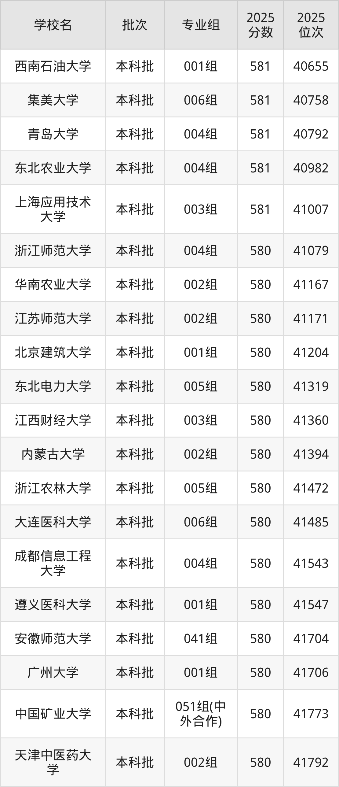 2025年安徽高考物理类580分(41063名~41859名)能上的大学有北京建筑大学001组、成都理工大学007组、成都信息工程大学004组、大连医科大学006组等。