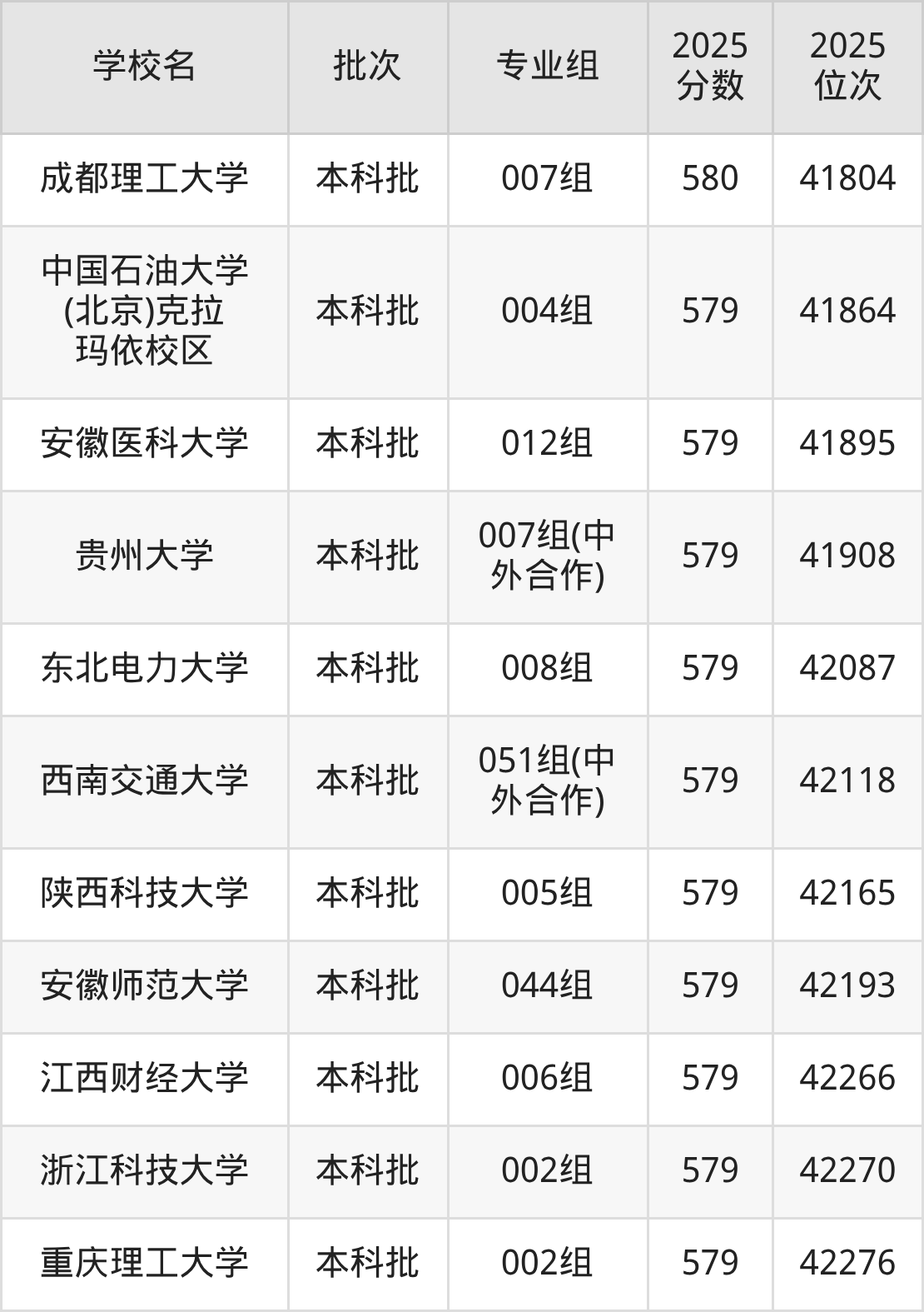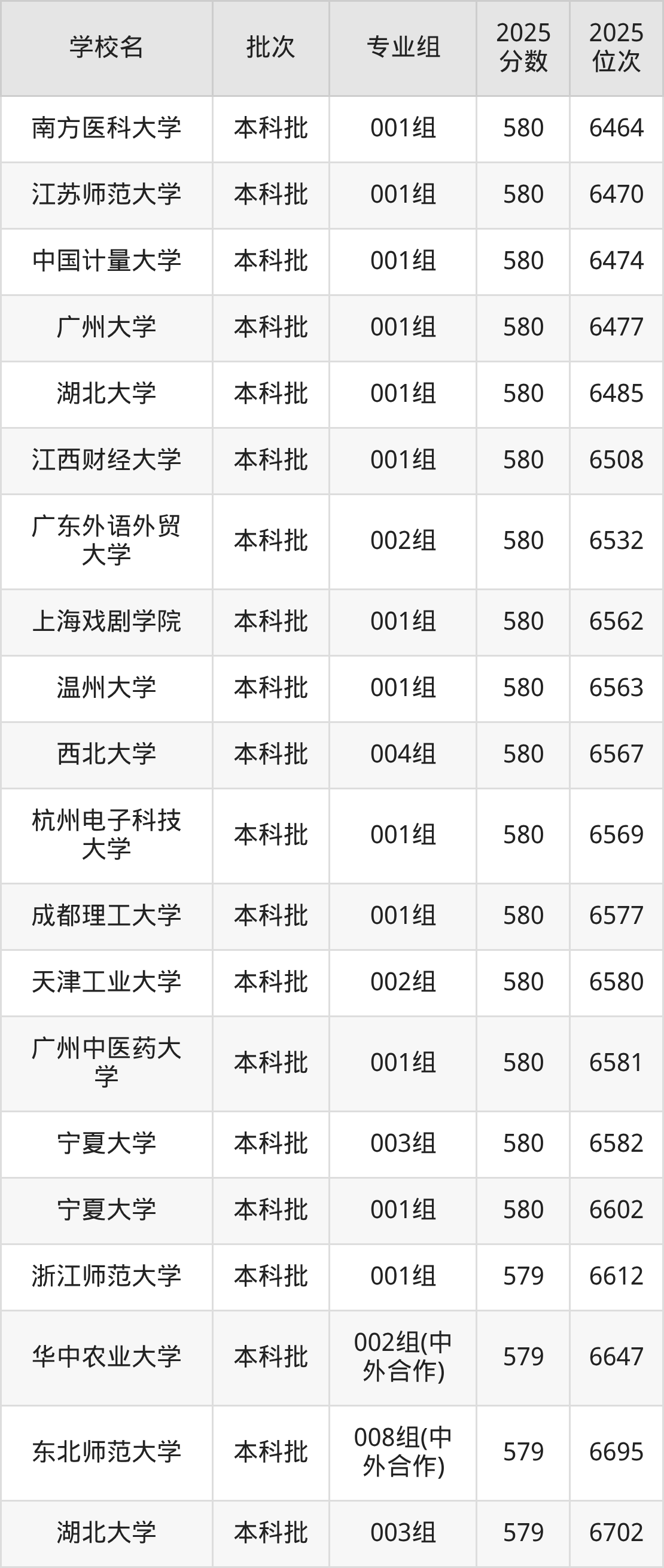 2025年安徽高考历史类580分(6407名~6603名)能上的大学有成都理工大学001组、广东外语外贸大学002组、广州大学001组、广州中医药大学001组等。