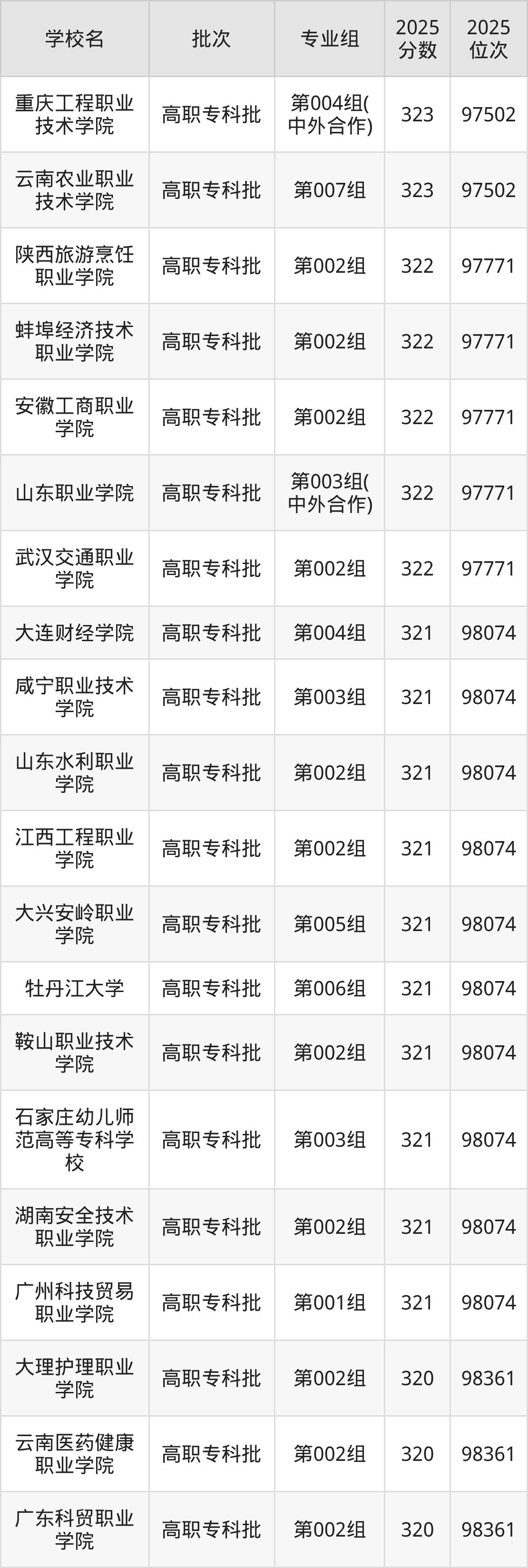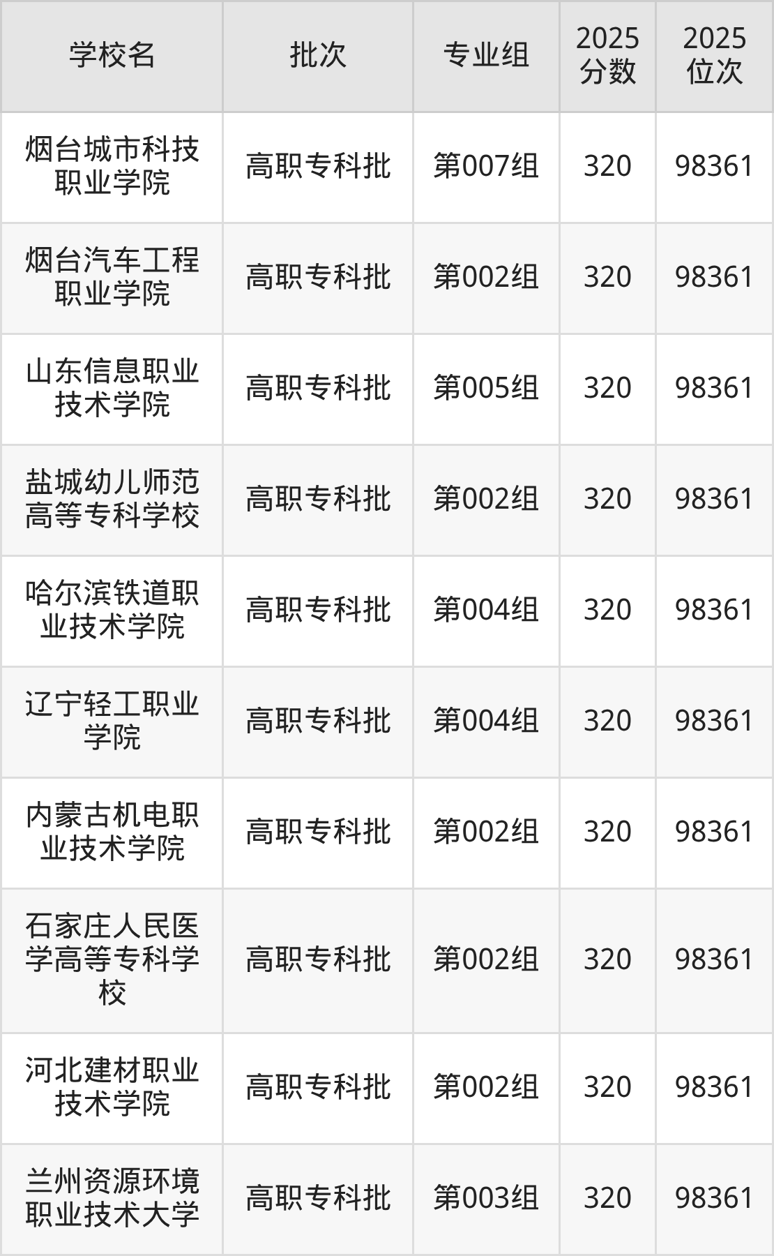 另外录取位次低于该区间(较稳妥)的有兰州资源环境职业技术大学第003组(98361名)、烟台汽车工程职业学院第002组(98361名)等;录取位次高于该区间(可冲)的有安徽工商职业学院第002组(97771名)、蚌埠经济技术职业学院第002组(97771名)等。