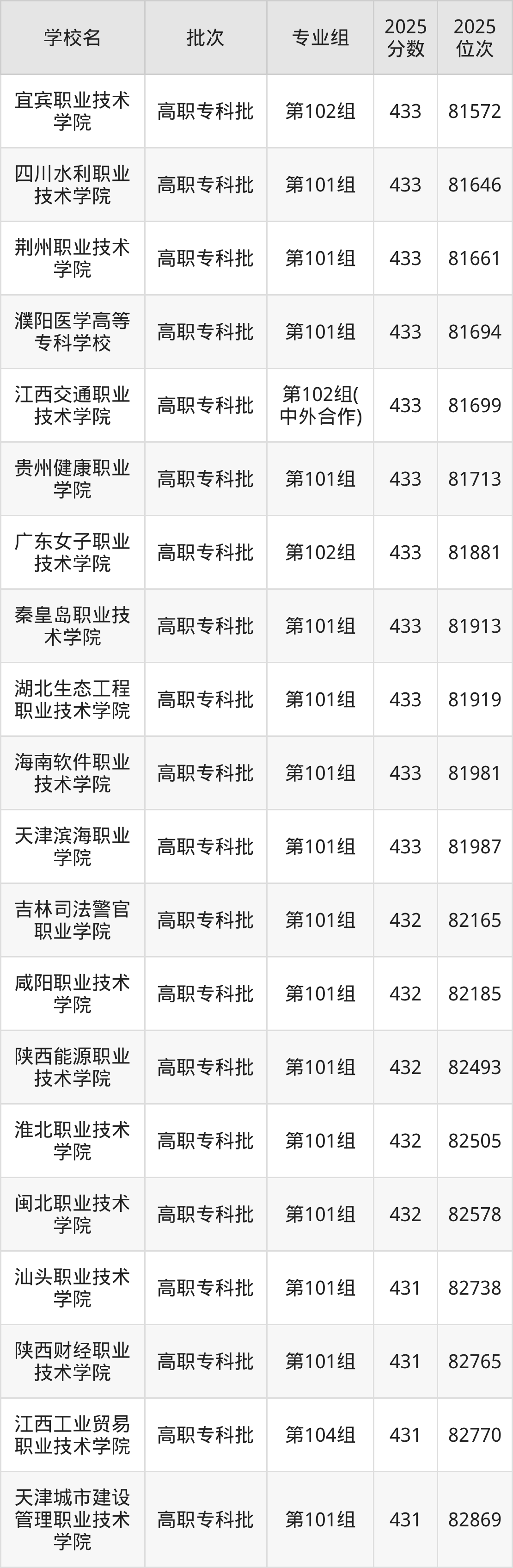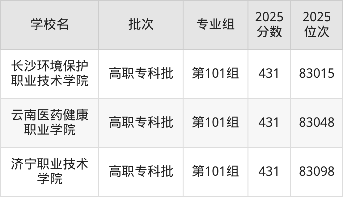 2025年江西高考历史类432分(82055名~82715名)能上的大学有淮北职业技术学院第101组、闽北职业技术学院第101组、吉林司法警官职业学院第101组、咸阳职业技术学院第101组等。