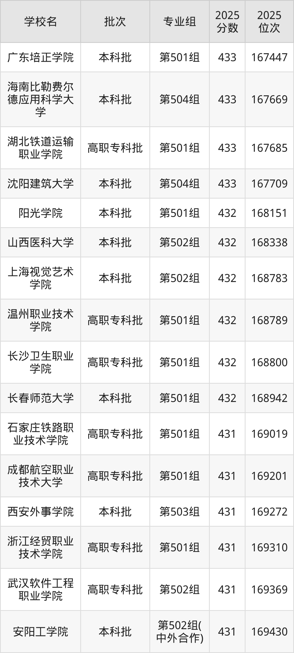 另外录取位次低于该区间(较稳妥)的有石家庄铁路职业技术学院第501组(169019名)、成都航空职业技术大学第501组(169201名)等;录取位次高于该区间(可冲)的有沈阳建筑大学第504组(167709名)、湖北铁道运输职业学院第501组(167685名)等。