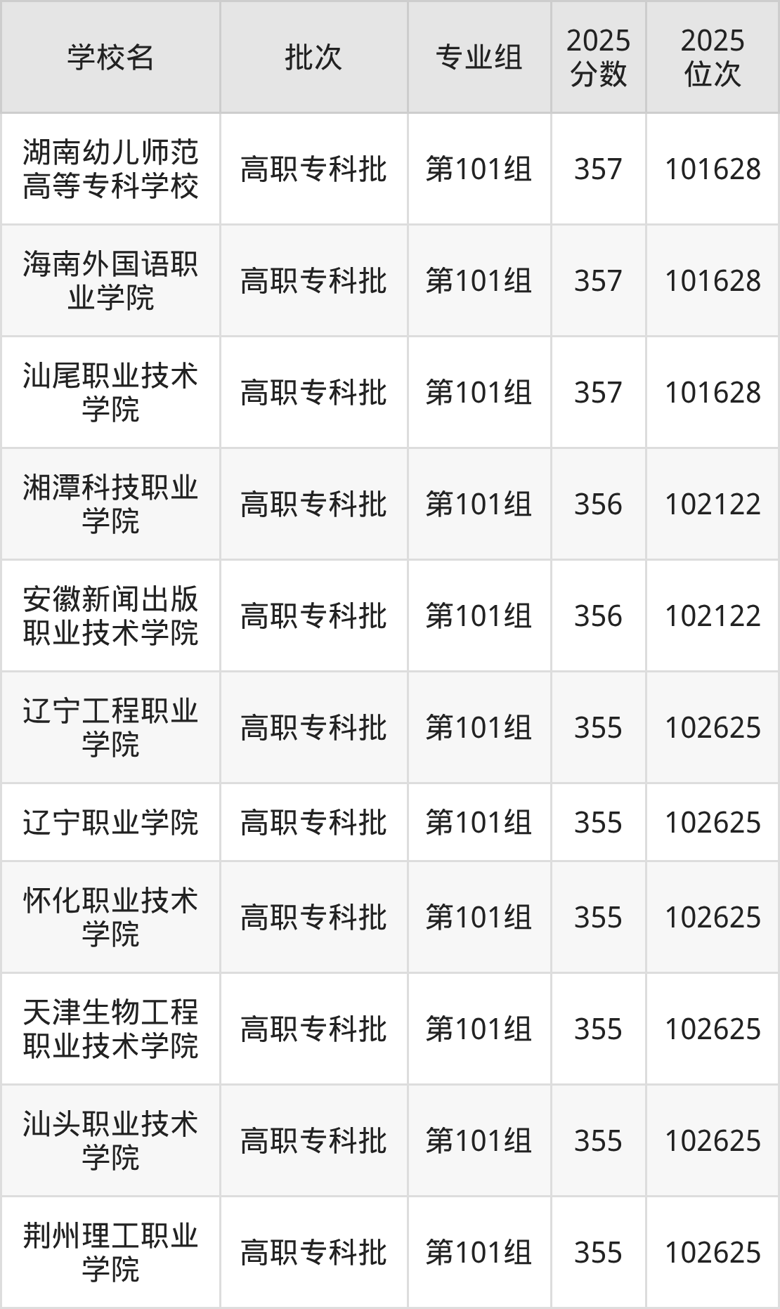 2025年湖南高考历史类355分(102123名~102625名)能上的大学有天津生物工程职业技术学院第101组、辽宁工程职业学院第101组、辽宁职业学院第101组、荆州理工职业学院第101组等。