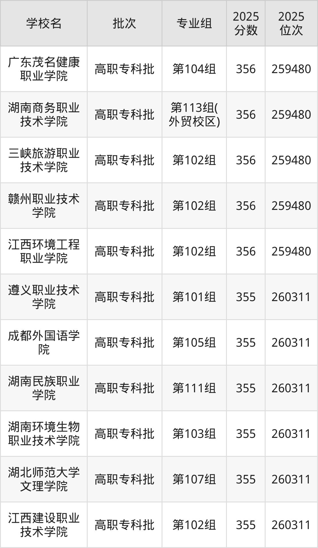 2025年湖南高考物理类355分(259481名~260311名)能上的大学有江西建设职业技术学院第102组、湖北师范大学文理学院第107组、湖南环境生物职业技术学院第103组、湖南民族职业学院第111组等。