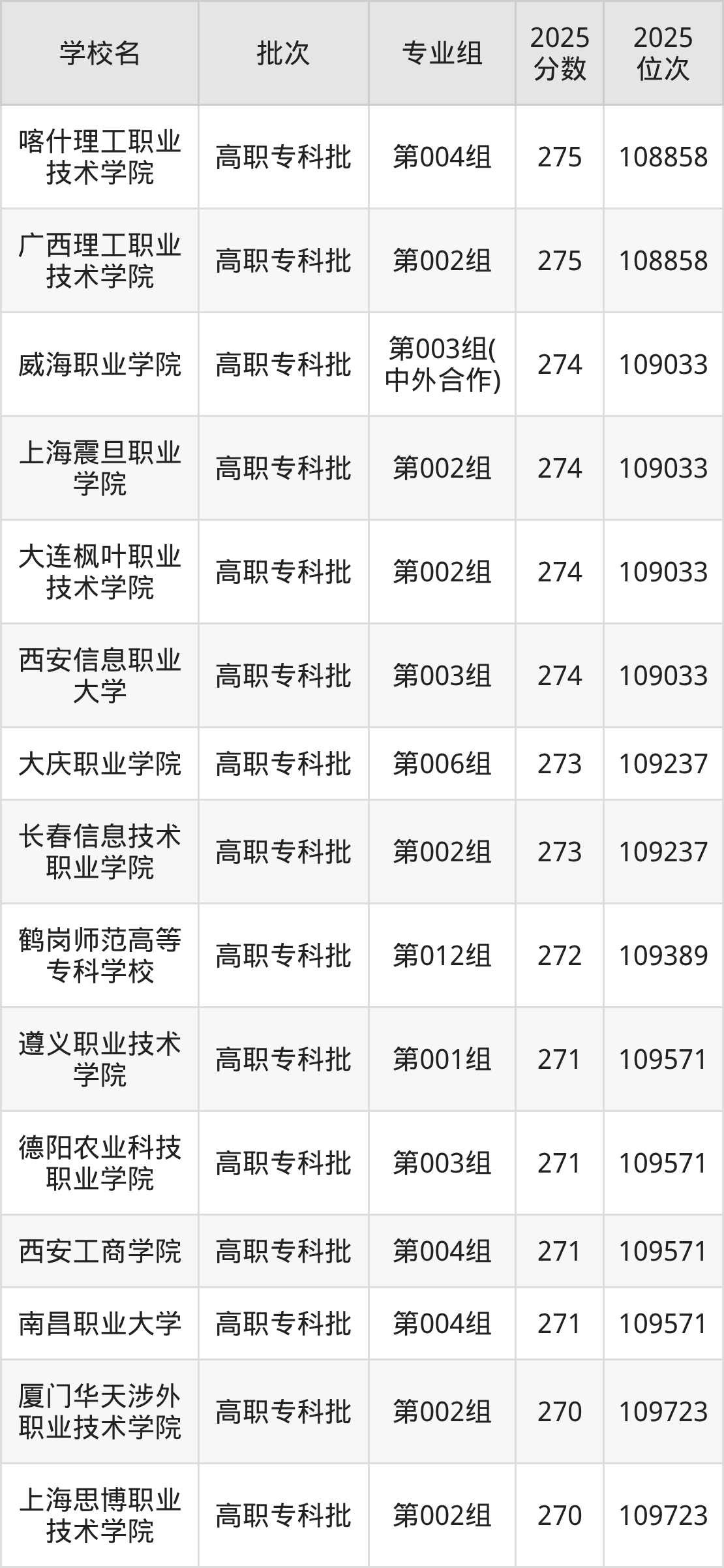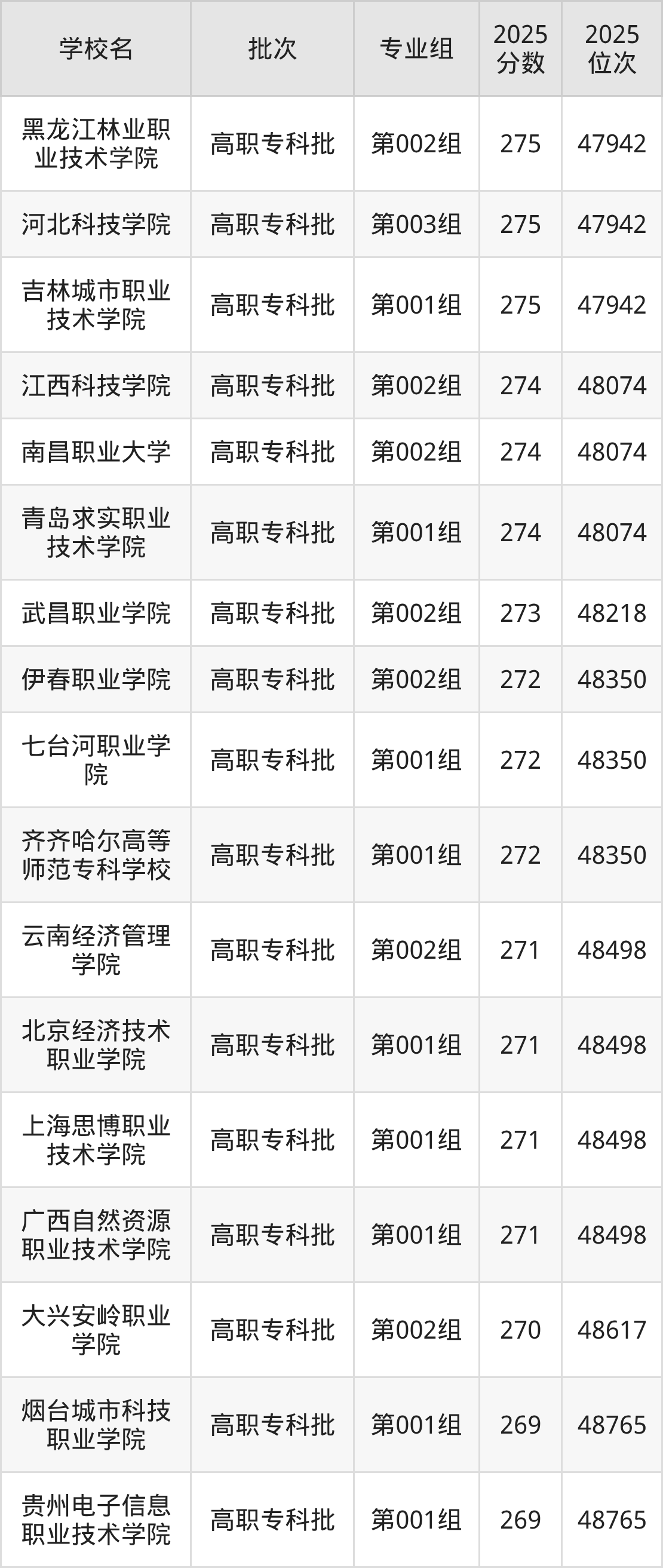 2025年黑龙江高考历史类272分(48219名~48350名)能上的大学有齐齐哈尔高等师范专科学校第001组、伊春职业学院第002组、七台河职业学院第001组。