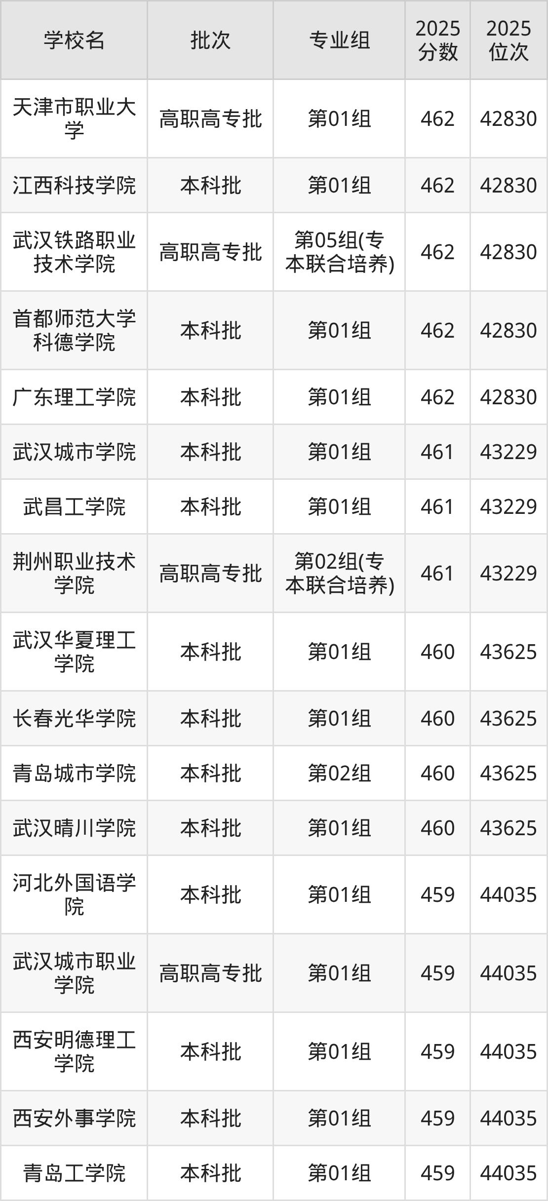 2025年湖北高考历史类460分(43230名~43625名)能上的大学有武汉晴川学院第01组、武汉华夏理工学院第01组、长春光华学院第01组、青岛城市学院第02组。