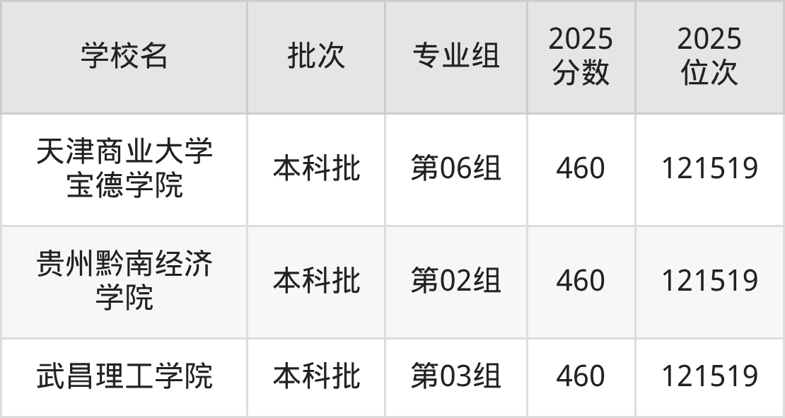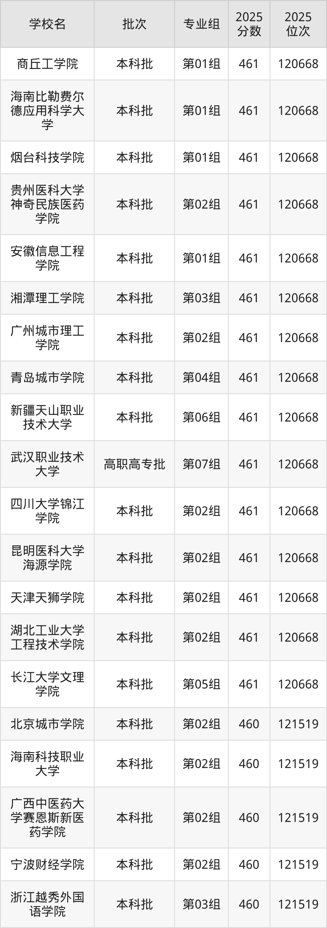 2025年湖北高考物理类460分(120669名~121519名)能上的大学有武昌理工学院第03组、北京城市学院第02组、天津商业大学宝德学院第06组、浙江越秀外国语学院第03组等。