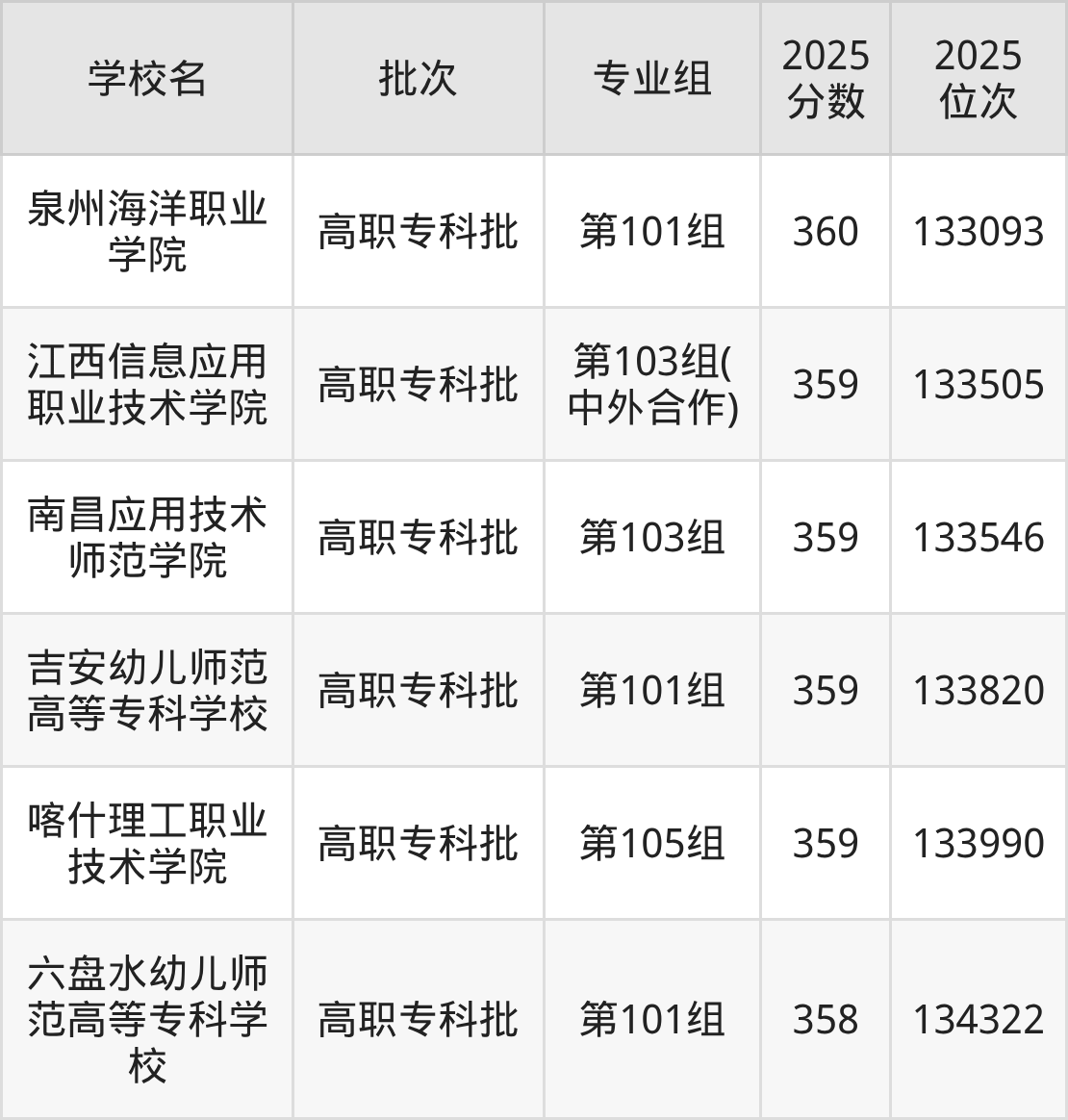 2025年江西高考历史类359分(133409名~134172名)能上的大学有喀什理工职业技术学院第105组、南昌应用技术师范学院第103组、江西信息应用职业技术学院第103组(中外合作)、吉安幼儿师范高等专科学校第101组。