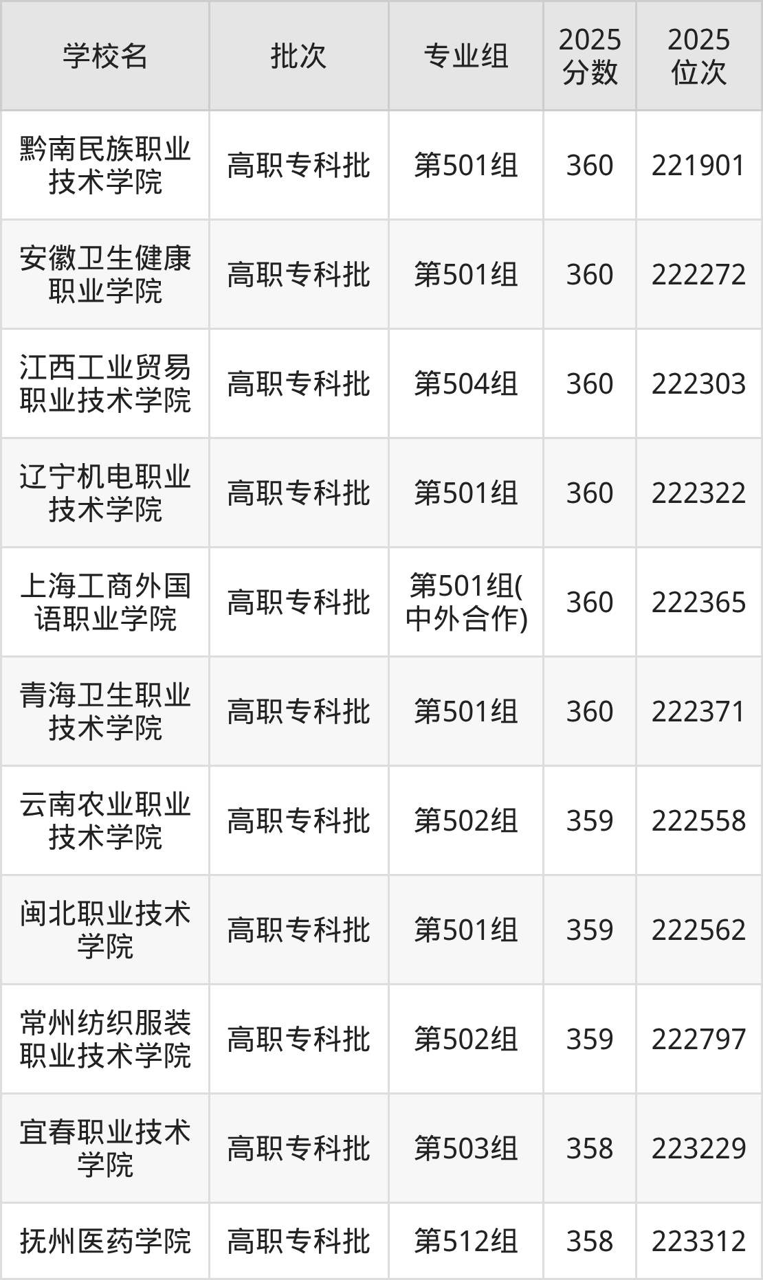 另外录取位次低于该区间(较稳妥)的有宜春职业技术学院第503组(223229名)、抚州医药学院第512组(223312名)等;录取位次高于该区间(可冲)的有青海卫生职业技术学院第501组(222371名)、上海工商外国语职业学院第501组(中外合作)(222365名)等。