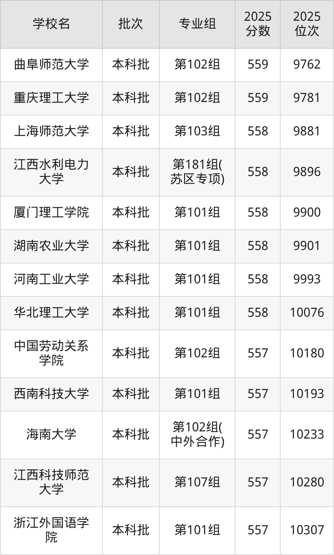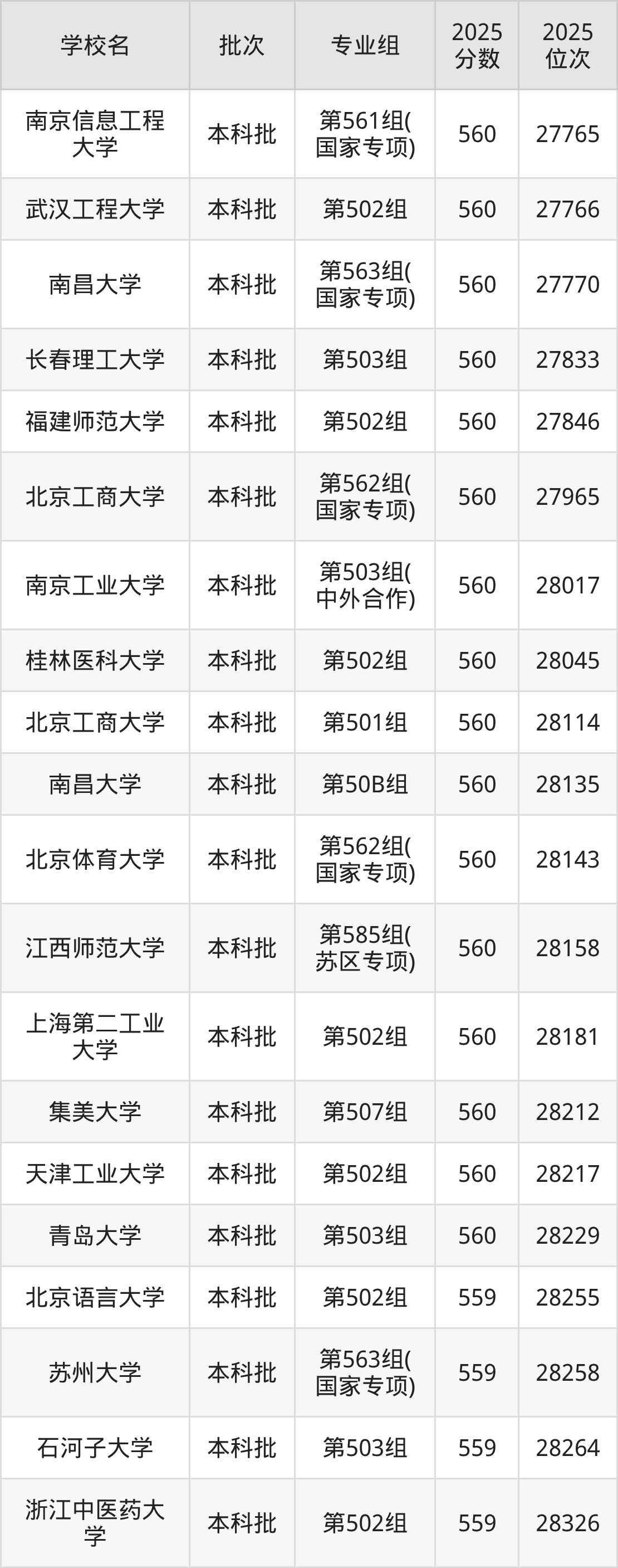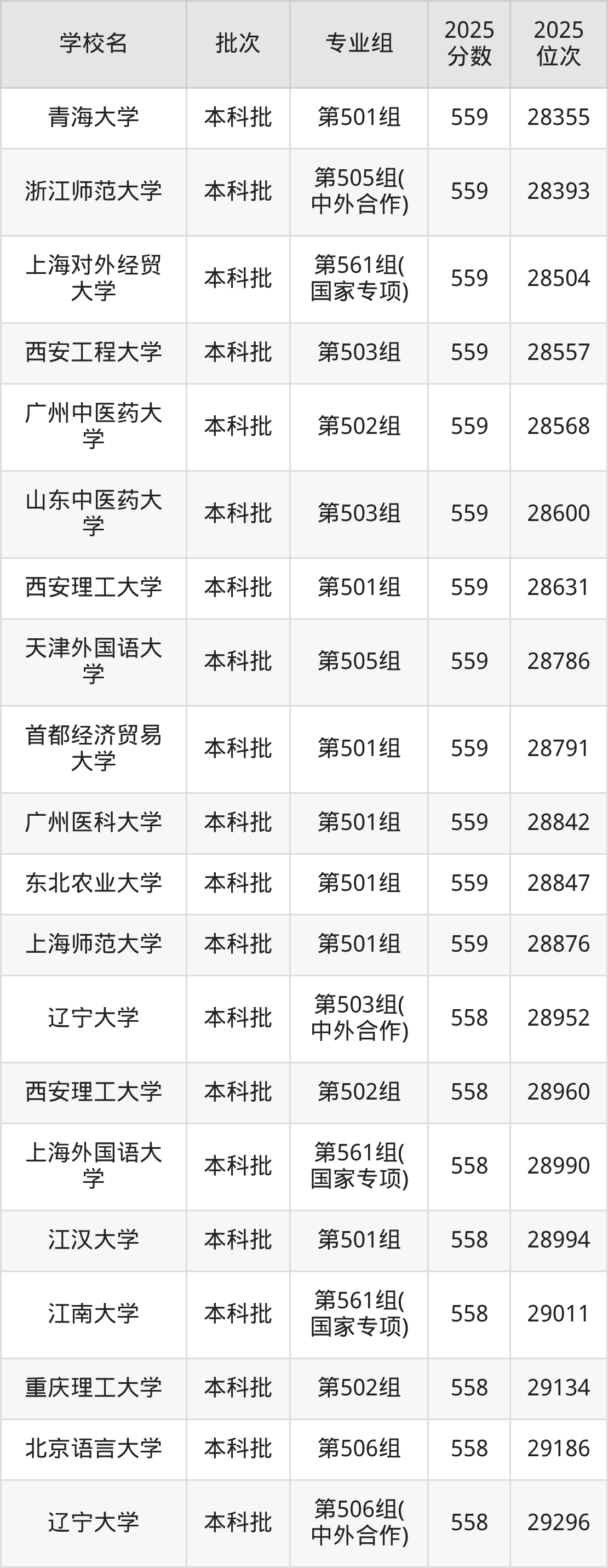 2025年江西高考物理类559分(28238名~28888名)能上的大学有浙江师范大学第505组(中外合作)、北京语言大学第502组、东北农业大学第501组、上海对外经贸大学第561组(国家专项)等。