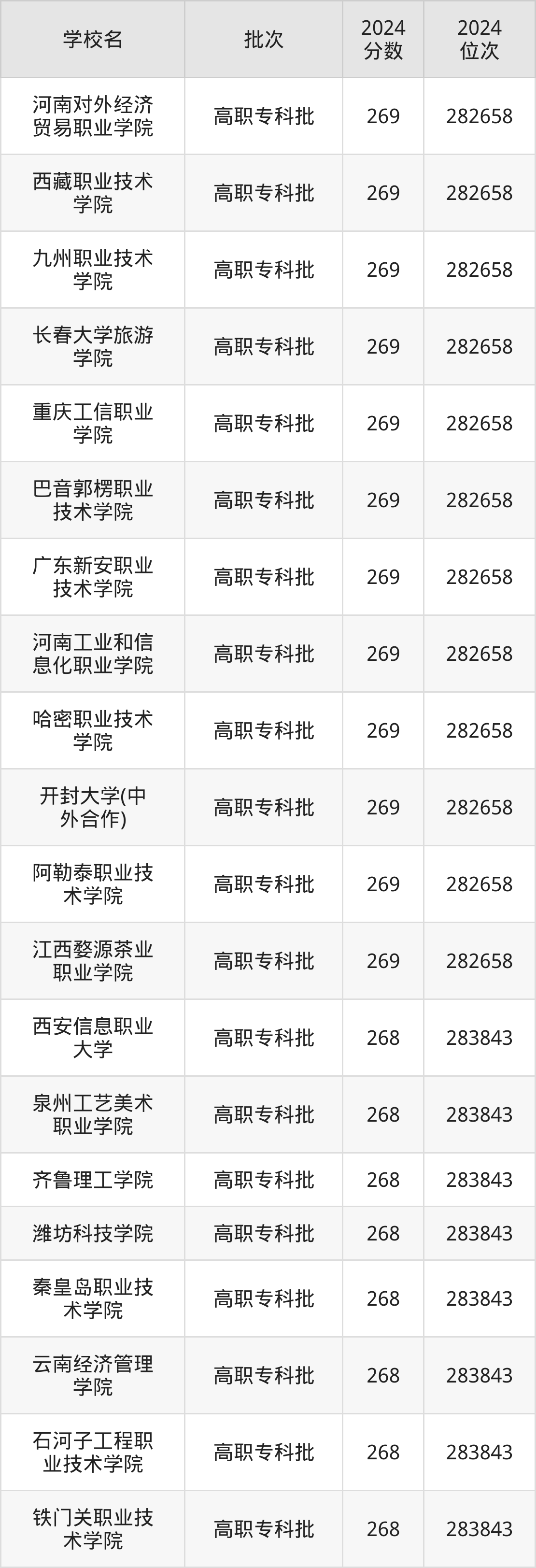 2024年河南高考文科268分(282659名~283843名)能上的大学有潍坊科技学院、齐鲁理工学院、云南经济管理学院、泉州工艺美术职业学院等。