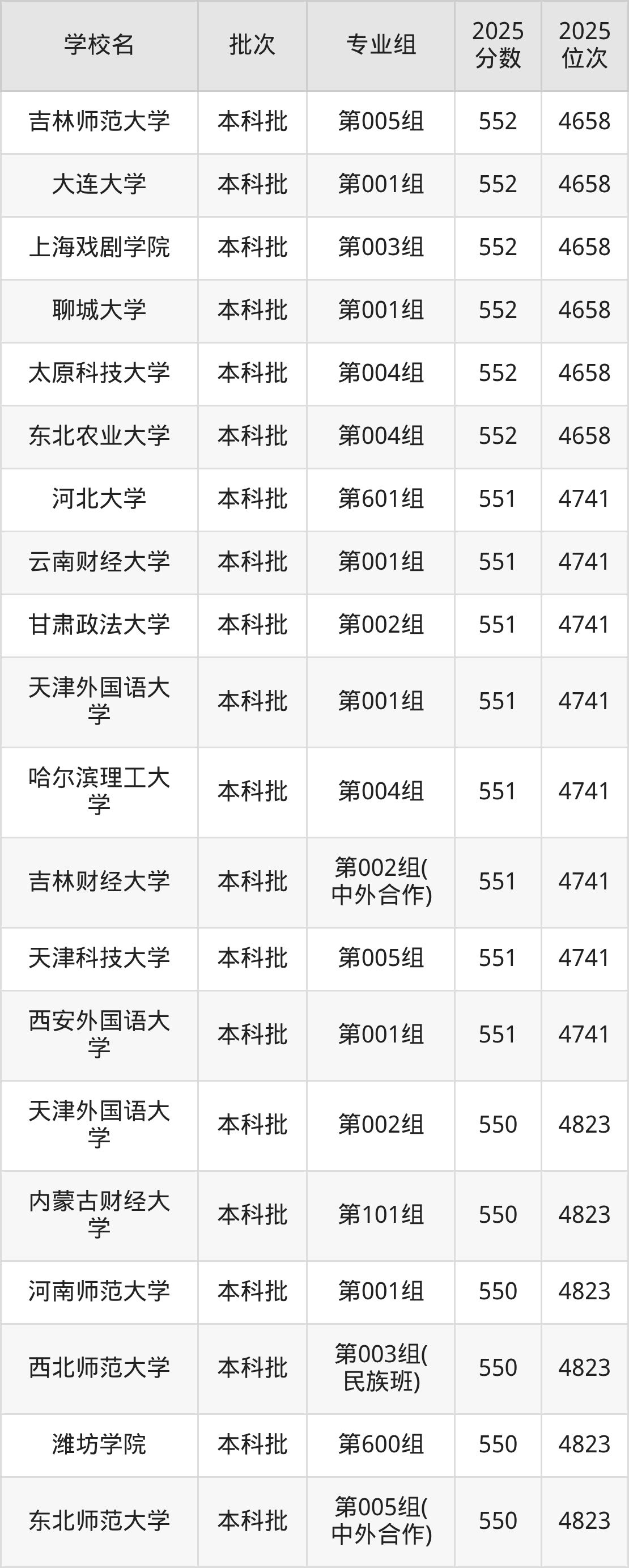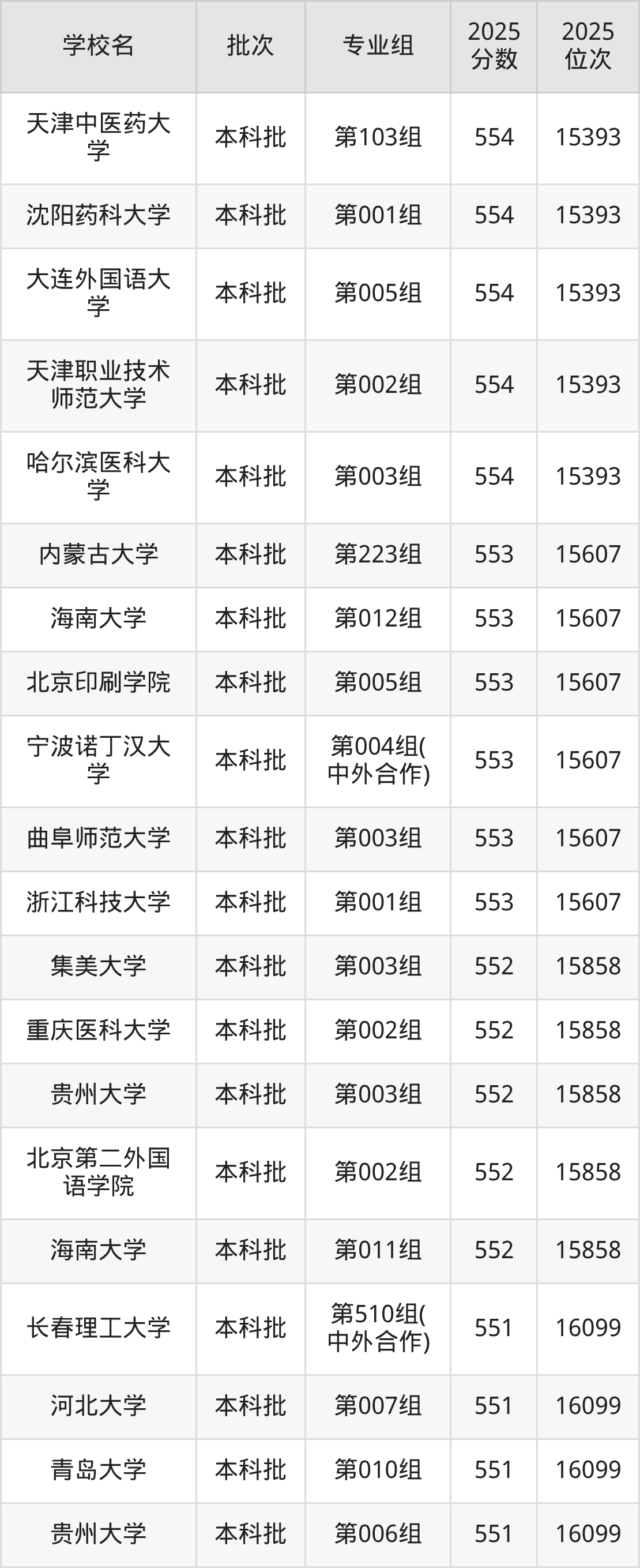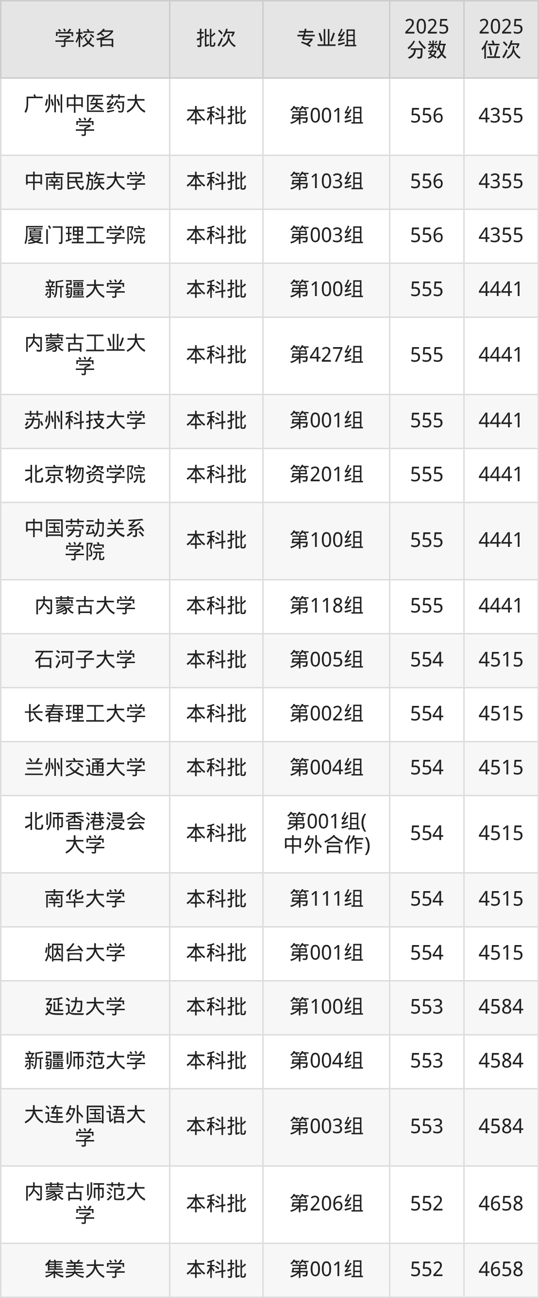 2025年内蒙古高考历史类553分(4516名~4584名)能上的大学有延边大学第100组、新疆师范大学第004组、大连外国语大学第003组。