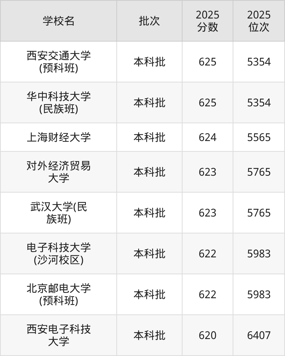 2025年重庆高考物理类622分(5766名~5983名)能上的大学有电子科技大学(沙河校区)、北京邮电大学(预科班)。