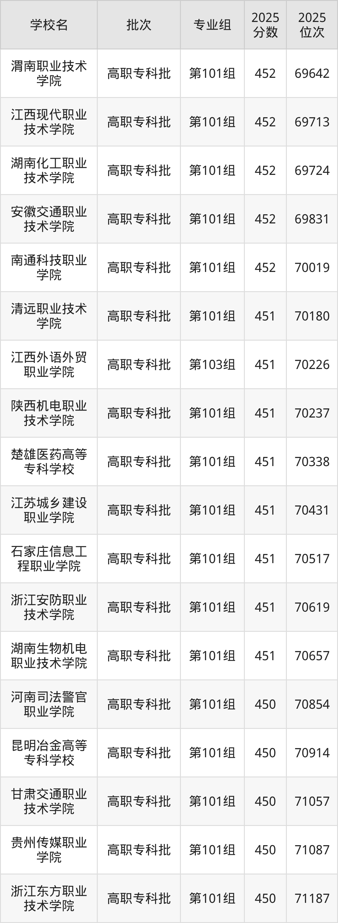 另外录取位次低于该区间(较稳妥)的有河南司法警官职业学院第101组(70854名)、昆明冶金高等专科学校第101组(70914名)等;录取位次高于该区间(可冲)的有南通科技职业学院第101组(70019名)、安徽交通职业技术学院第101组(69831名)等。