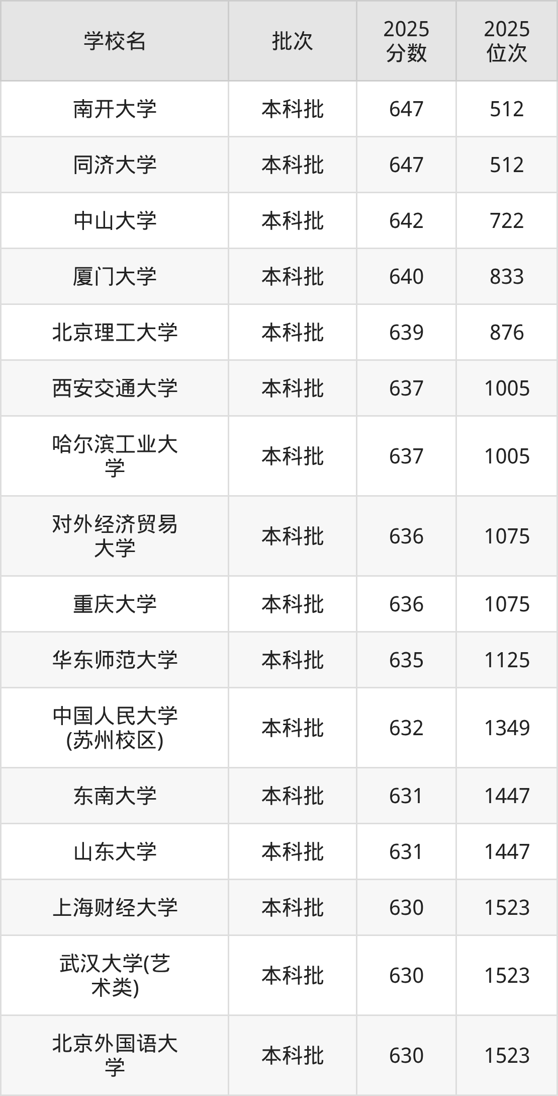 由于高考录取分数线历年波动较大,因此本文以该分数对应的位次排名为大家整理能上的大学名单。