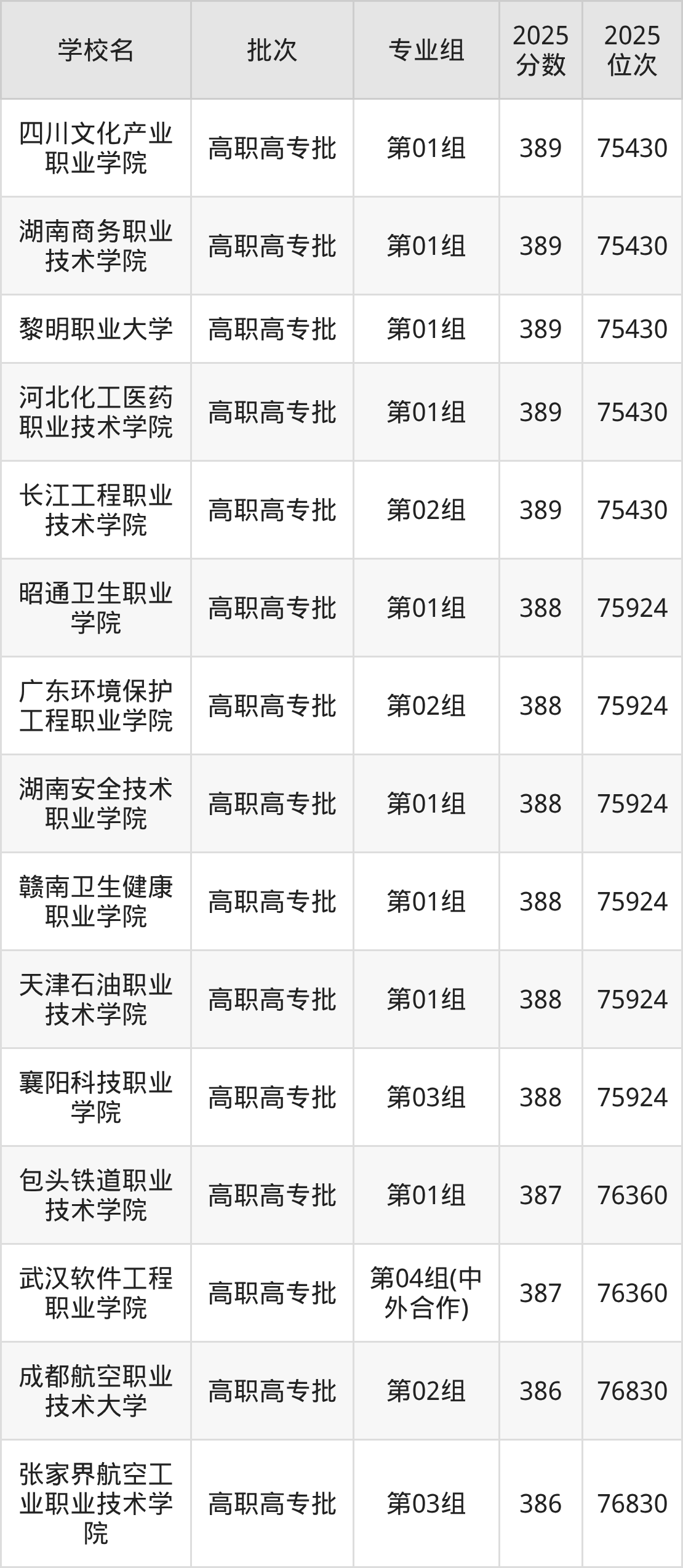 2025年湖北高考历史类387分(75925名~76360名)能上的大学有武汉软件工程职业学院第04组(中外合作)、包头铁道职业技术学院第01组。