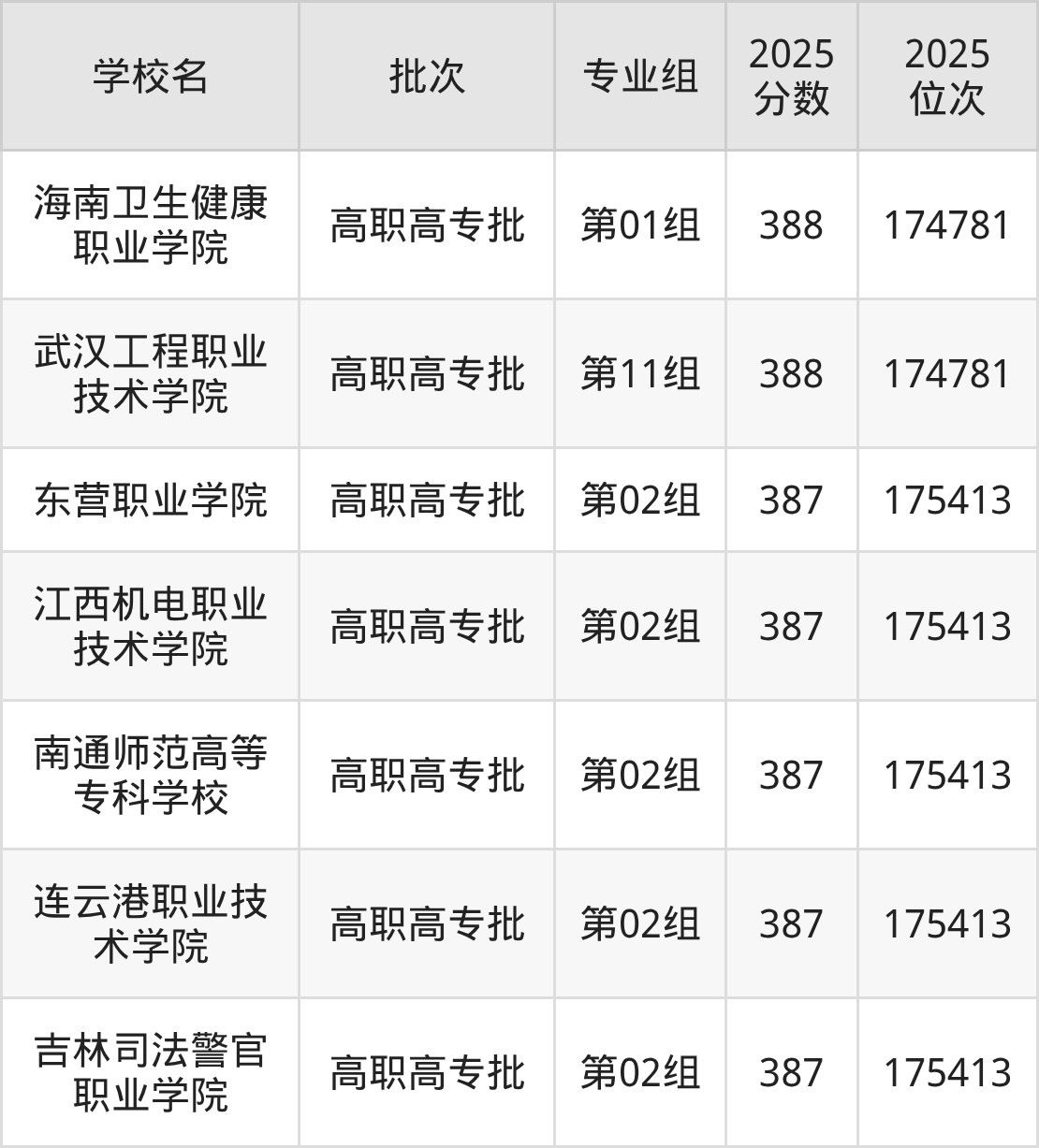 2025年湖北高考物理类387分(174782名~175413名)能上的大学有吉林司法警官职业学院第02组、连云港职业技术学院第02组、南通师范高等专科学校第02组、江西机电职业技术学院第02组等。