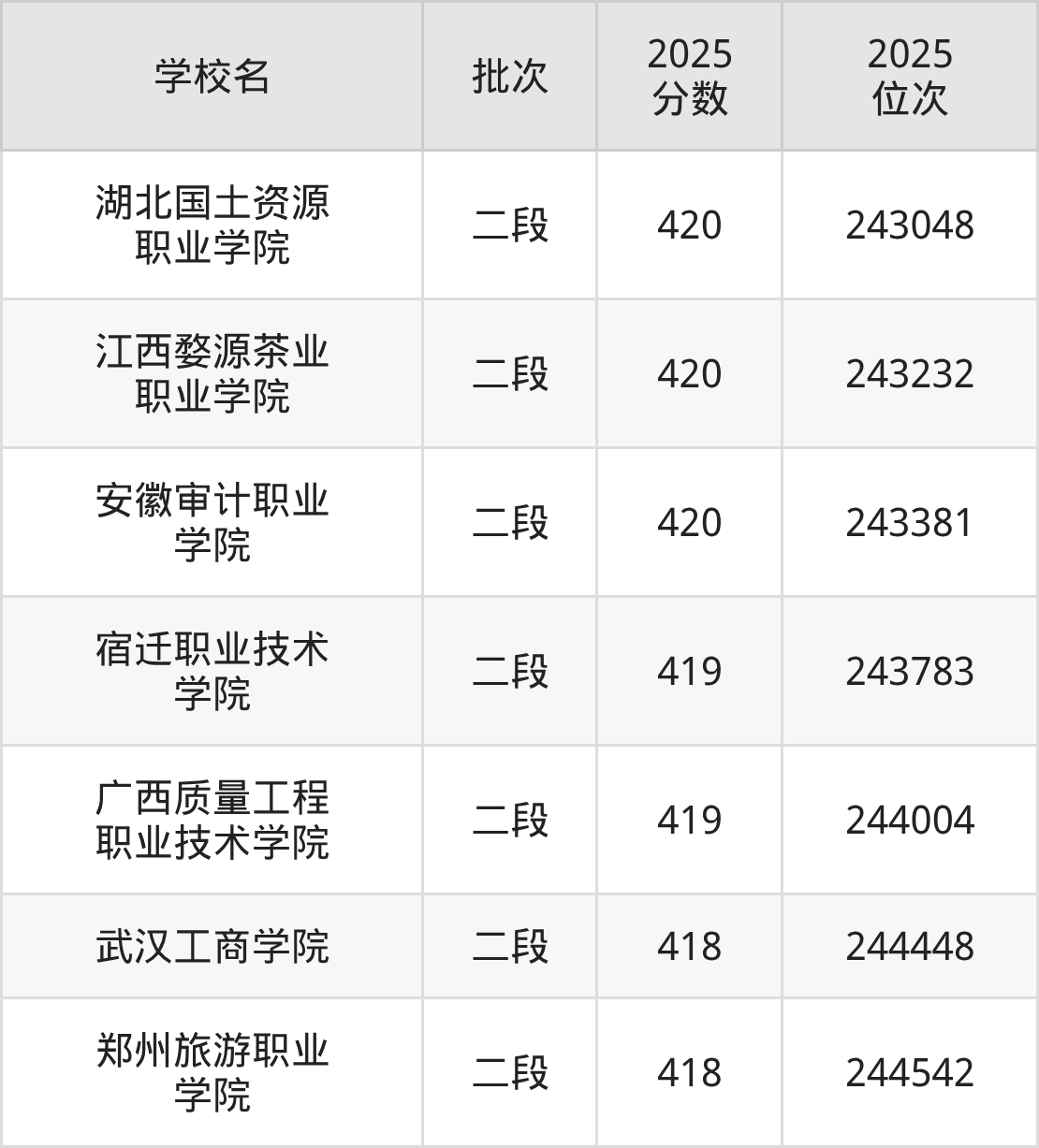 另外录取位次低于该区间(较稳妥)的有武汉工商学院(244448名)、郑州旅游职业学院(244542名)等;录取位次高于该区间(可冲)的有安徽审计职业学院(243381名)、江西婺源茶业职业学院(243232名)等。