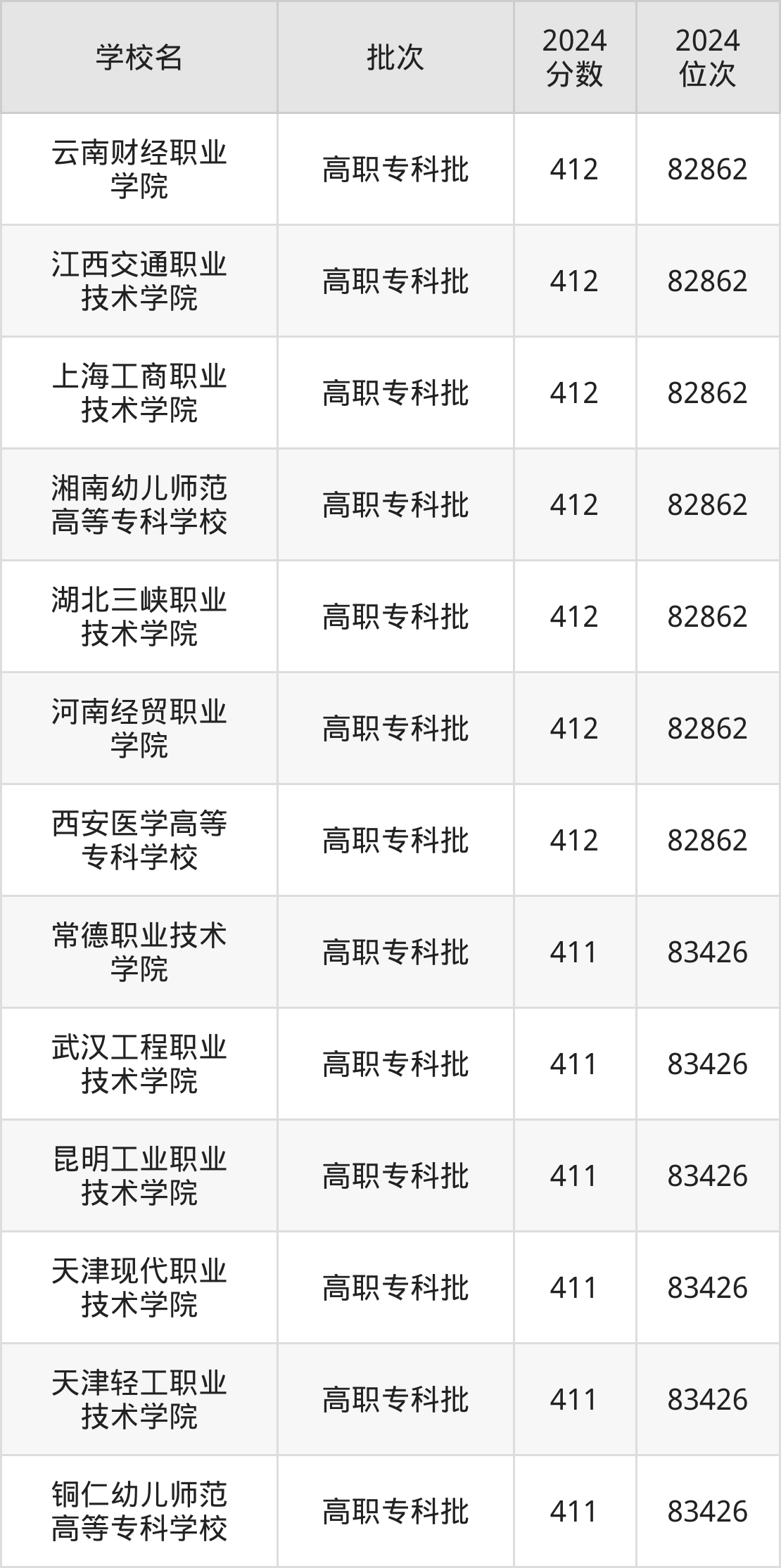 2024年云南高考文科411分(82863名~83426名)能上的大学有铜仁幼儿师范高等专科学校、武汉工程职业技术学院、天津现代职业技术学院、天津轻工职业技术学院等。