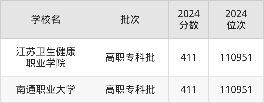 2024年云南高考理科411分(110299名~110951名)能上的大学有江苏卫生健康职业学院、南通职业大学。
