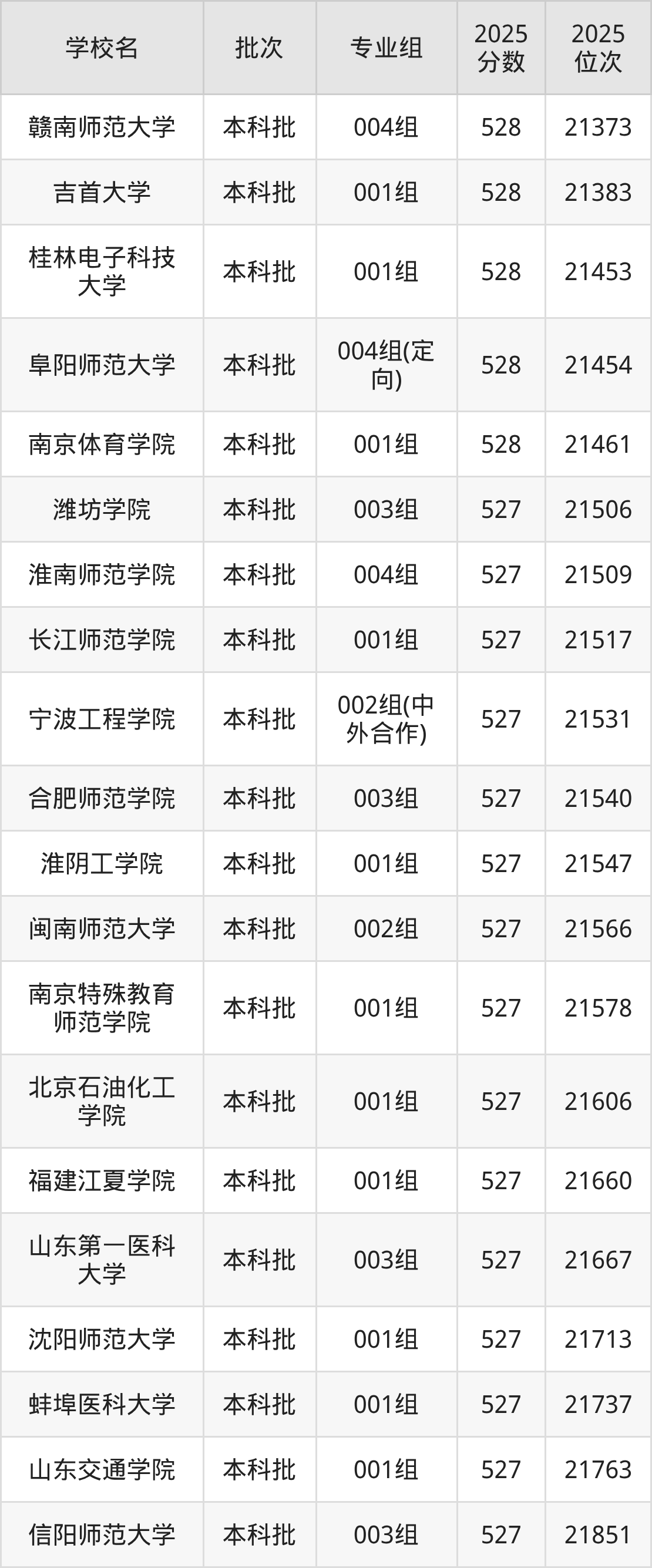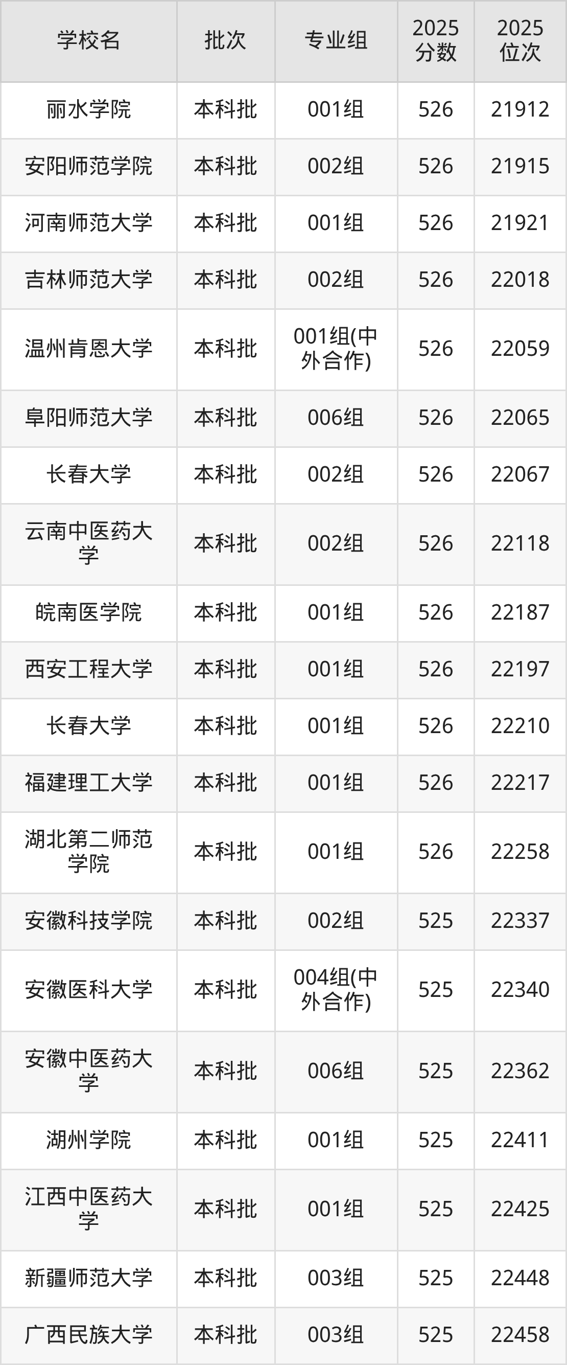 2025年安徽高考历史类526分(21859名~22270名)能上的大学有安阳师范学院002组、长春大学001组、长春大学002组、福建理工大学001组等。