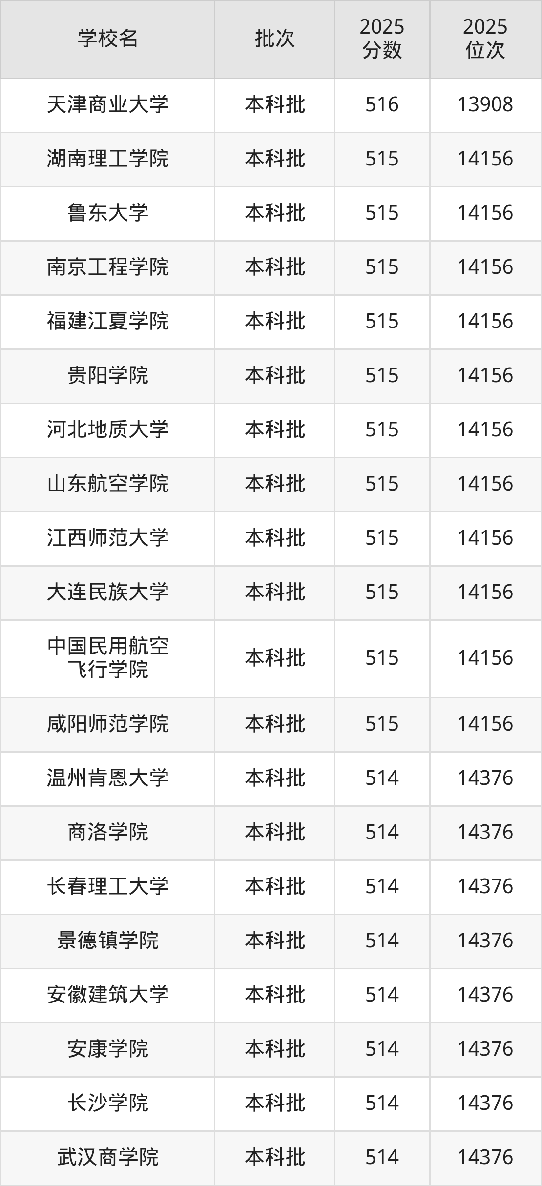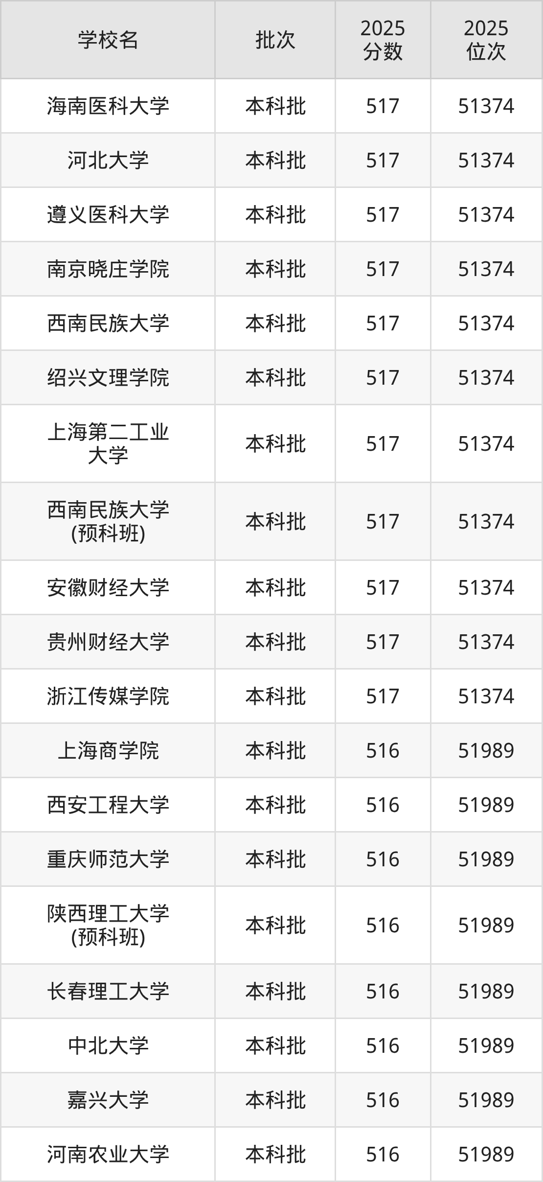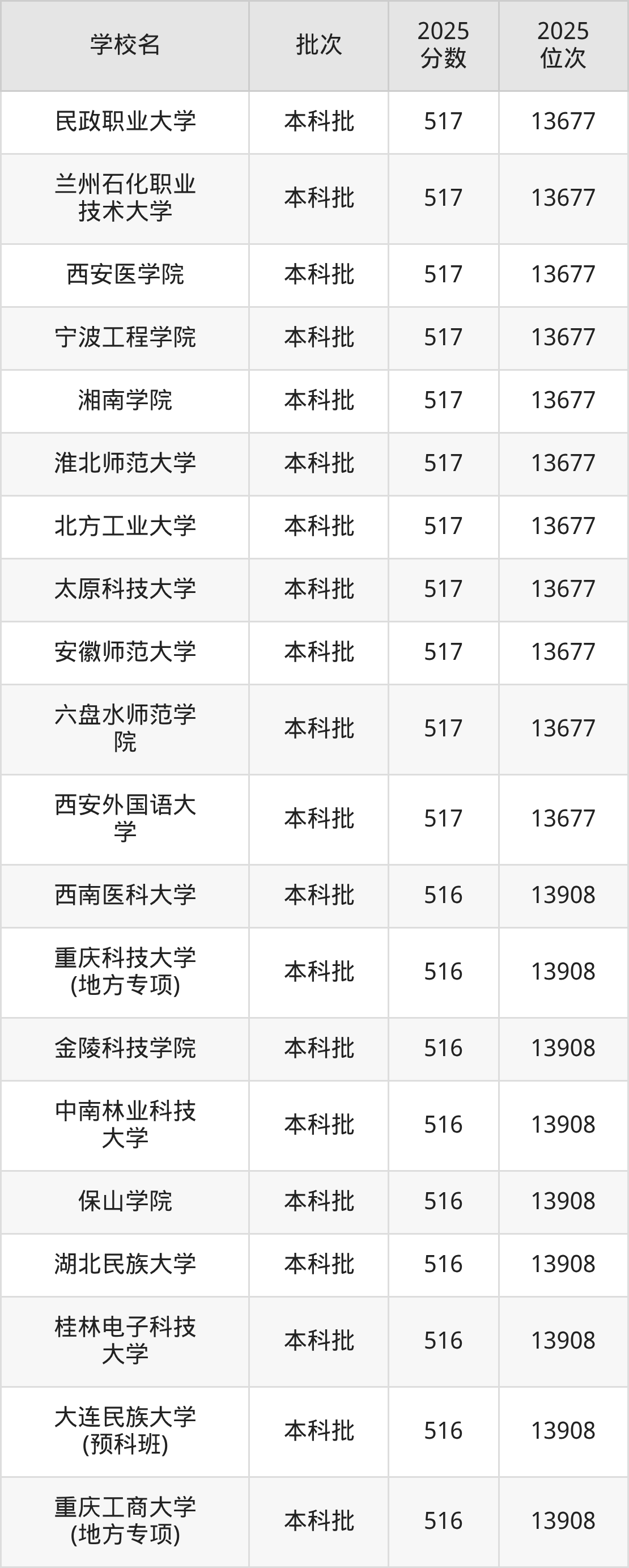 2025年重庆高考历史类516分(13678名~13908名)能上的大学有天津商业大学、大连民族大学(预科班)、桂林电子科技大学、湖北民族大学等。
