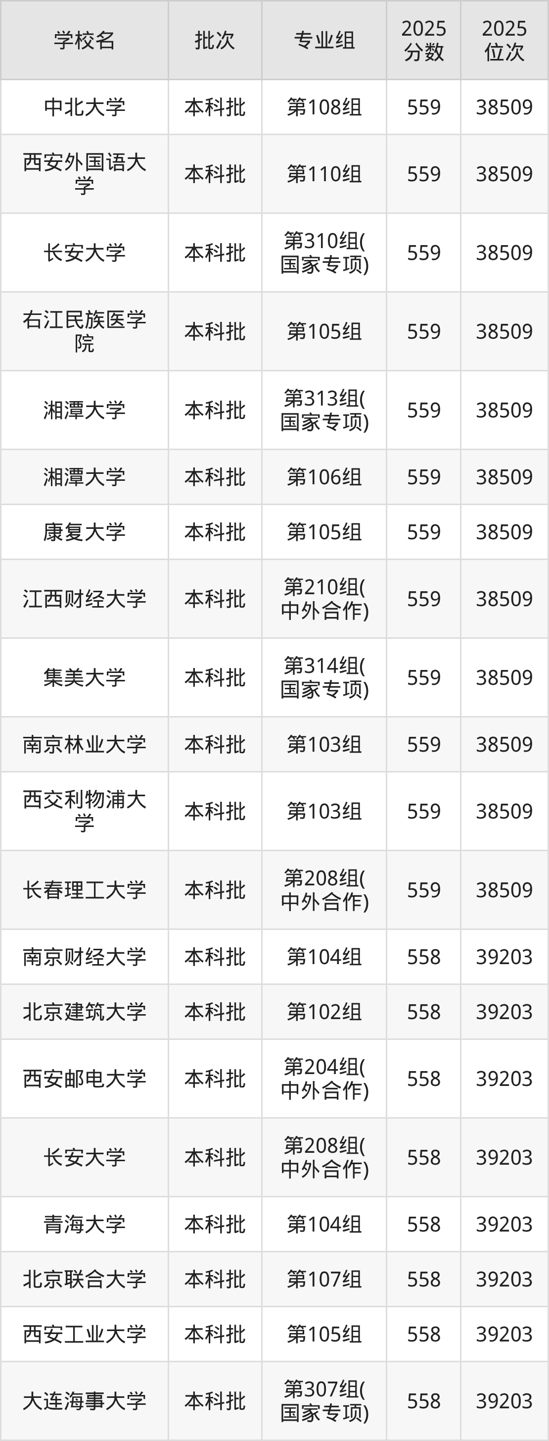 2025年湖南高考物理类558分(38510名~39203名)能上的大学有北京联合大学第107组、北京建筑大学第102组、大连海事大学第307组(国家专项)、东北林业大学第105组等。