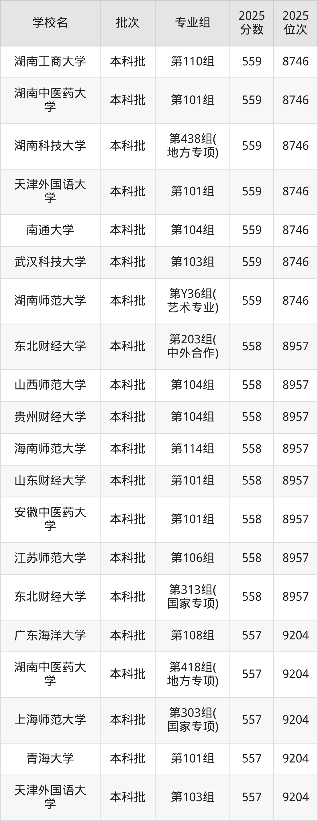 2025年湖南高考历史类558分(8747名~8957名)能上的大学有山西师范大学第104组、东北财经大学第203组(中外合作)、东北财经大学第313组(国家专项)、江苏师范大学第106组等。