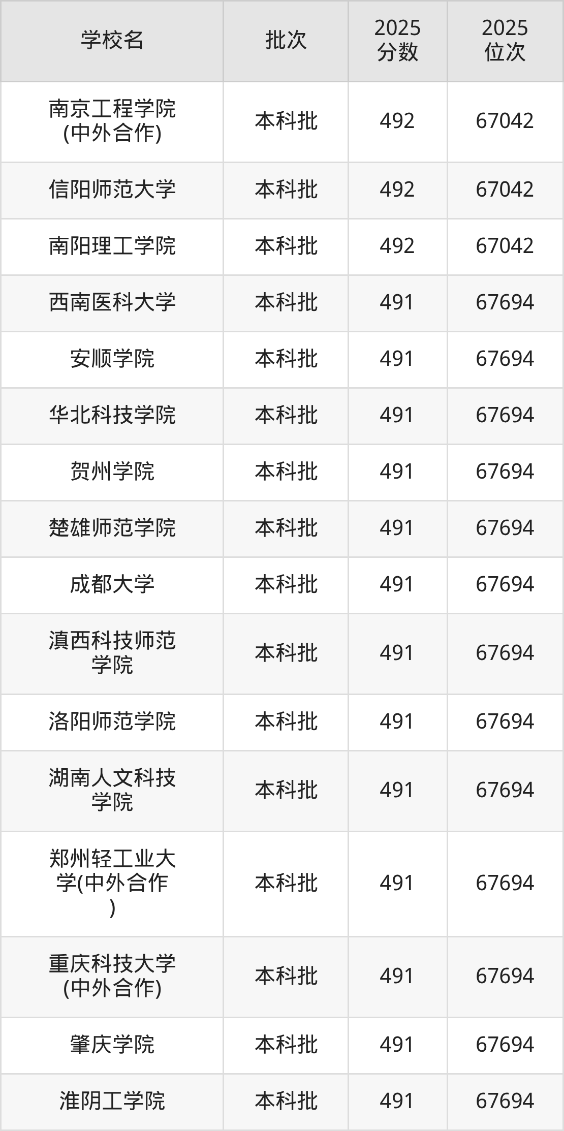 2025年重庆高考物理类491分(67043名~67694名)能上的大学有淮阴工学院、肇庆学院、重庆科技大学(中外合作)、郑州轻工业大学(中外合作)等。