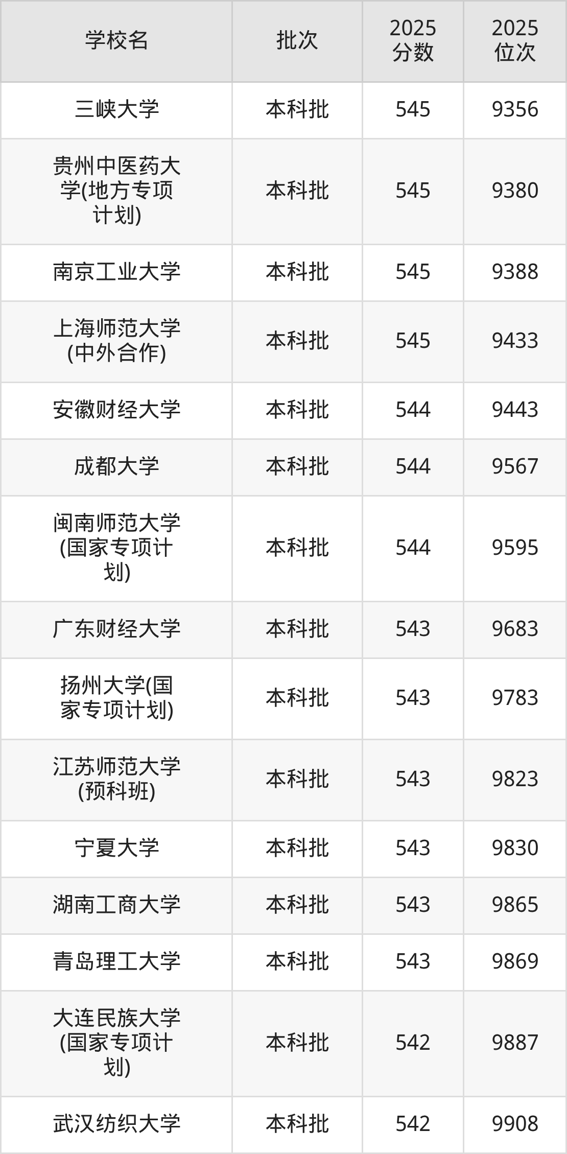 二、贵州545分位次排名能上的大学