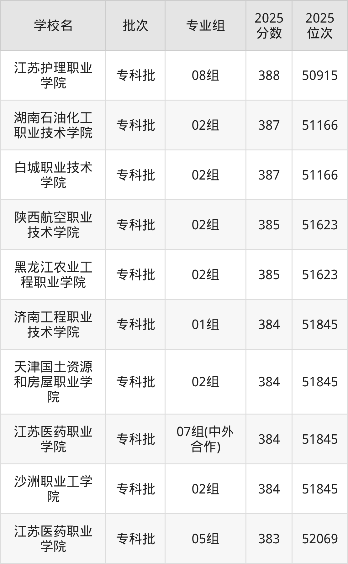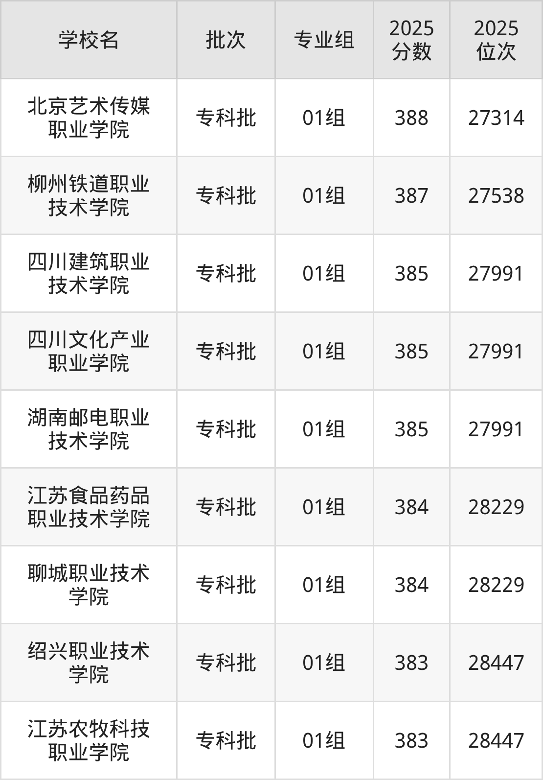 2025年江苏高考历史类385分(27772名~27991名)能上的大学有湖南邮电职业技术学院01组、四川建筑职业技术学院01组、四川文化产业职业学院01组。
