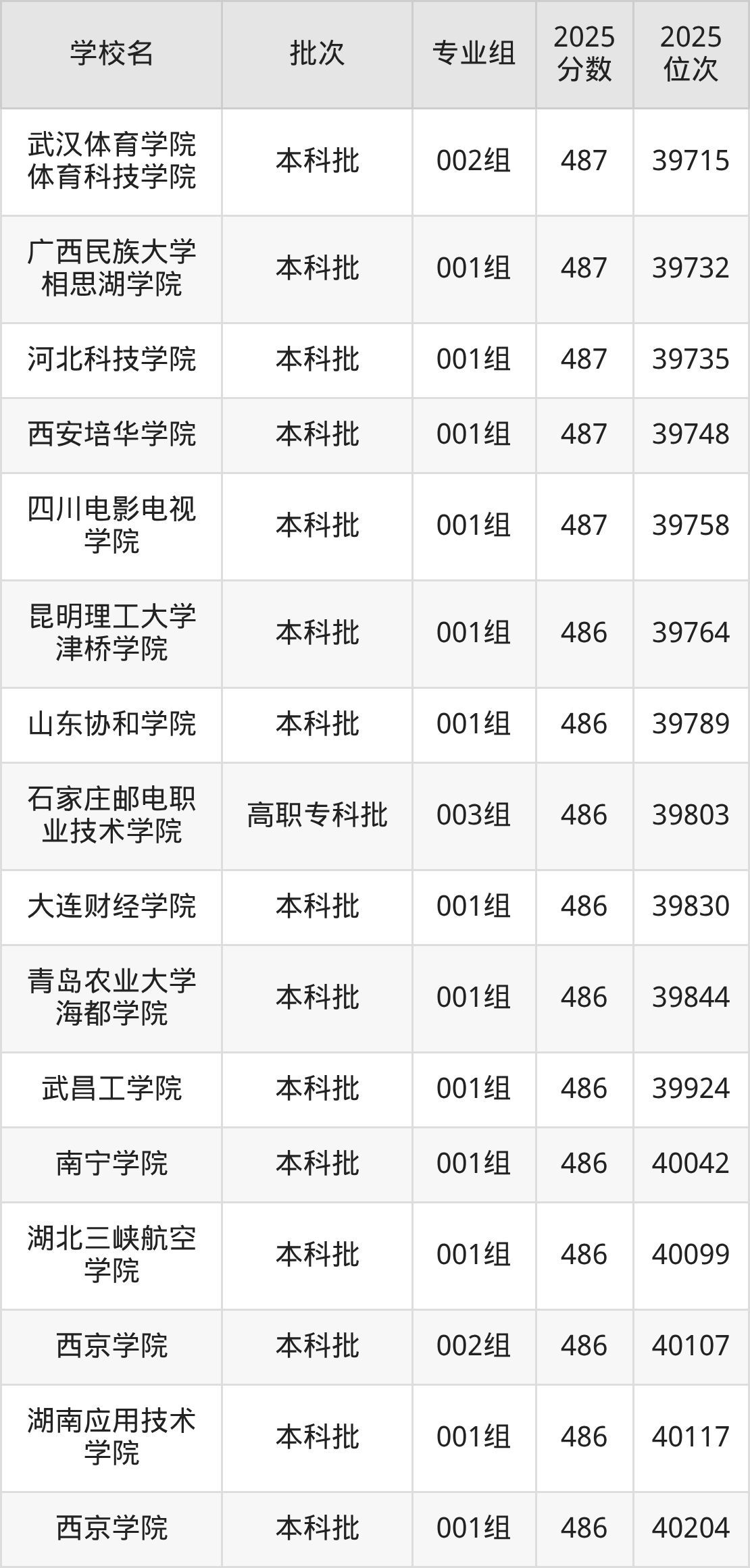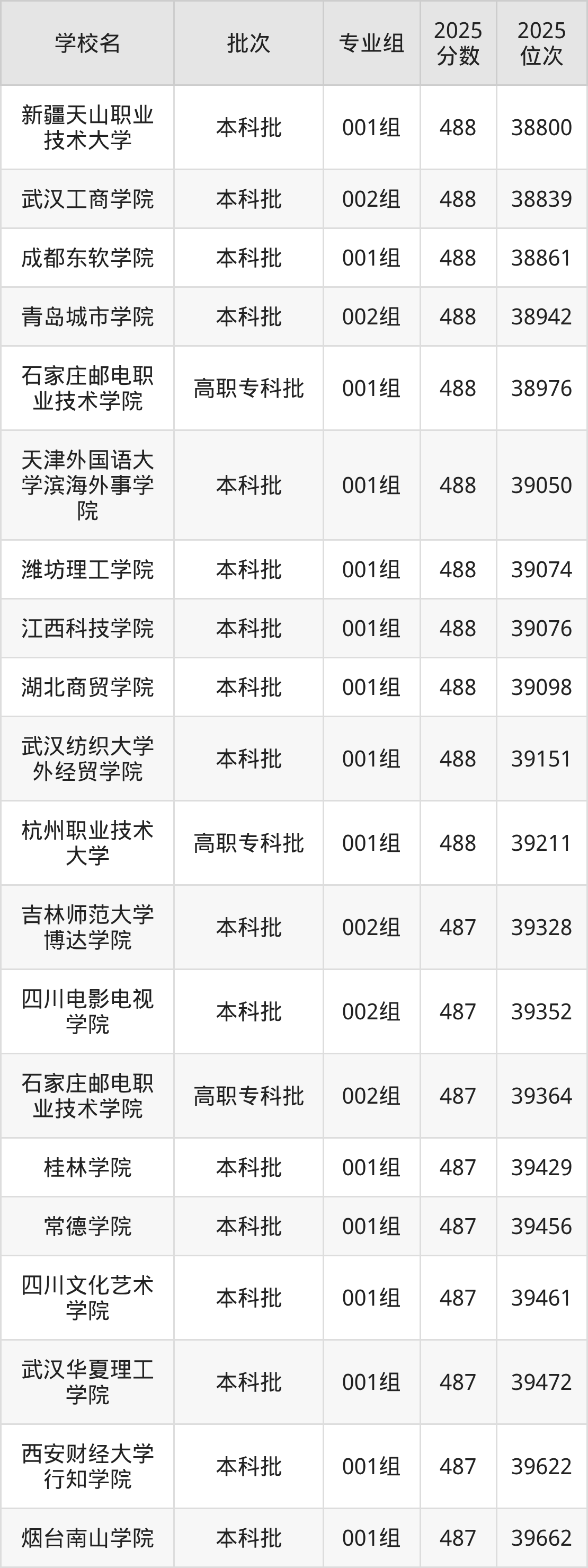 2025年安徽高考历史类487分(39248名~39761名)能上的大学有常德学院001组、桂林学院001组、河北科技学院001组、四川电影电视学院001组等。