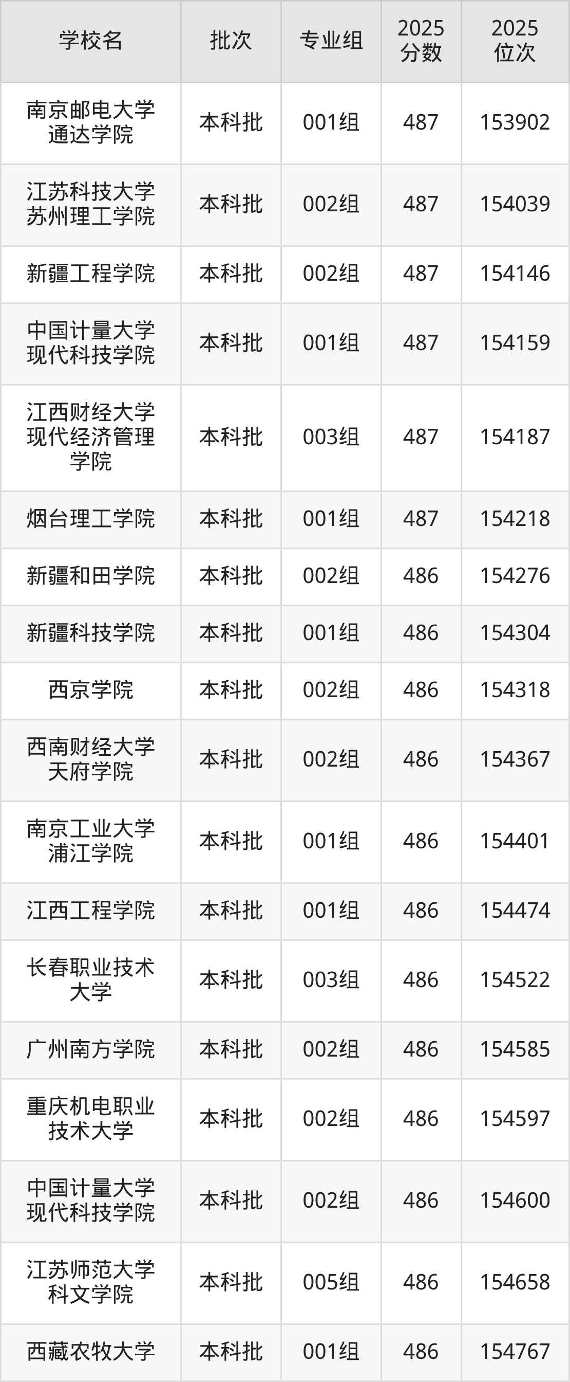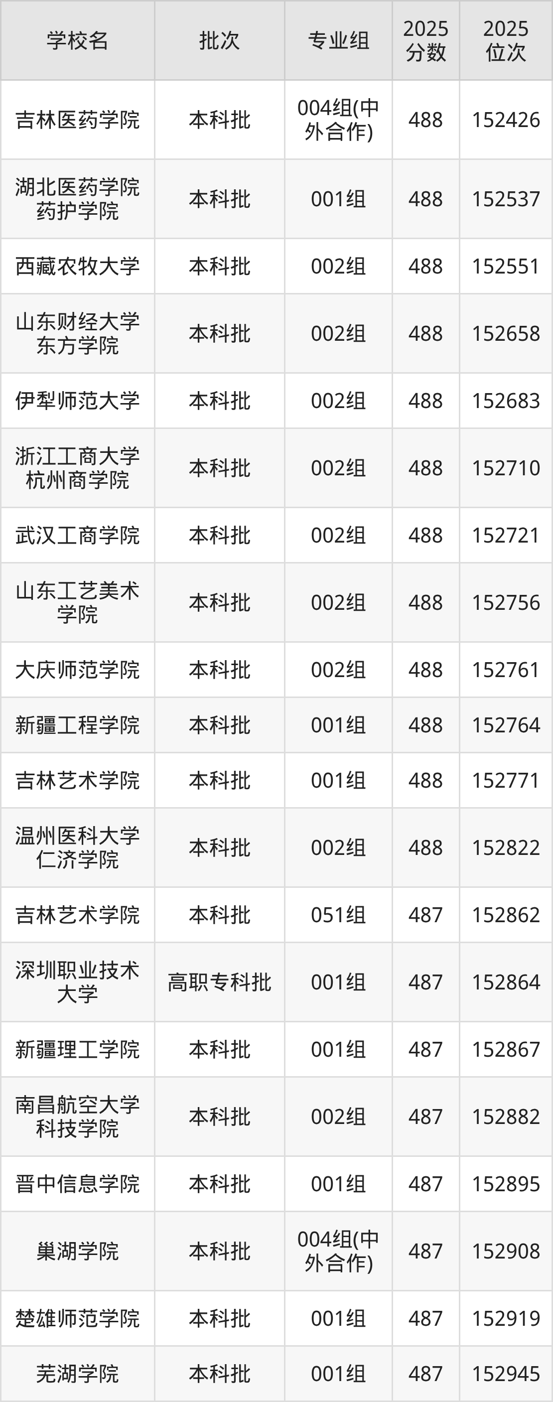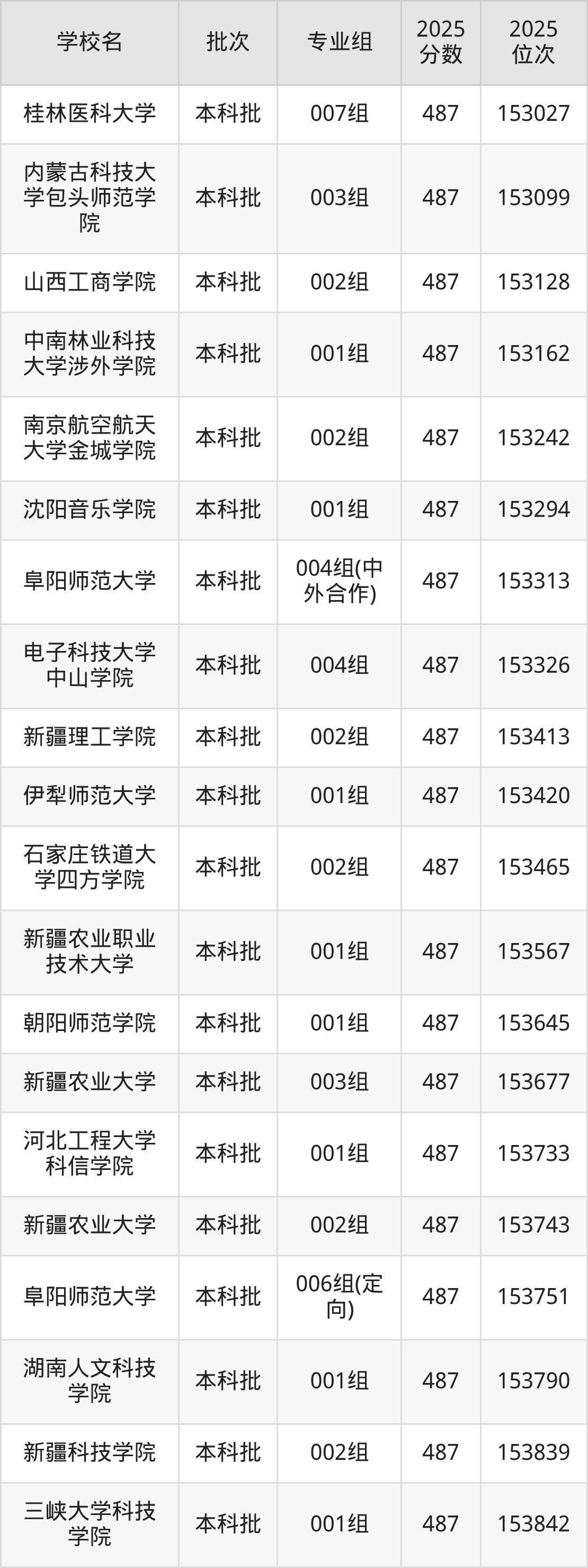 2025年安徽高考物理类487分(152847名~154269名)能上的大学有朝阳师范学院001组、楚雄师范学院001组、桂林医科大学007组、湖南人文科技学院001组等。