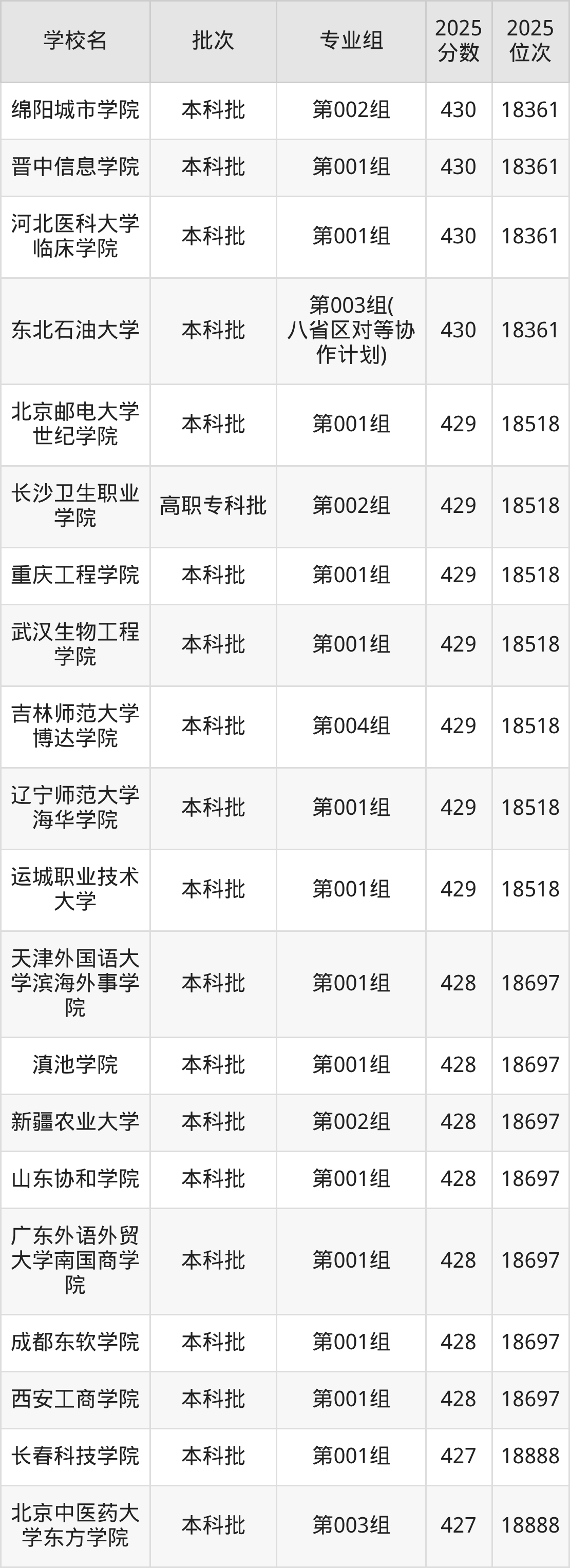 2025年黑龙江高考历史类429分(18362名~18518名)能上的大学有北京邮电大学世纪学院第001组、运城职业技术大学第001组、辽宁师范大学海华学院第001组、吉林师范大学博达学院第004组等。