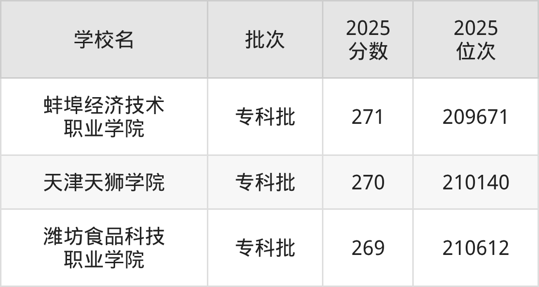 另外录取位次低于该区间(较稳妥)的有潍坊食品科技职业学院(210612名)、湖北工业职业技术学院(211076名)等;录取位次高于该区间(可冲)的有蚌埠经济技术职业学院(209671名)、石家庄金融职业学院(208712名)等。