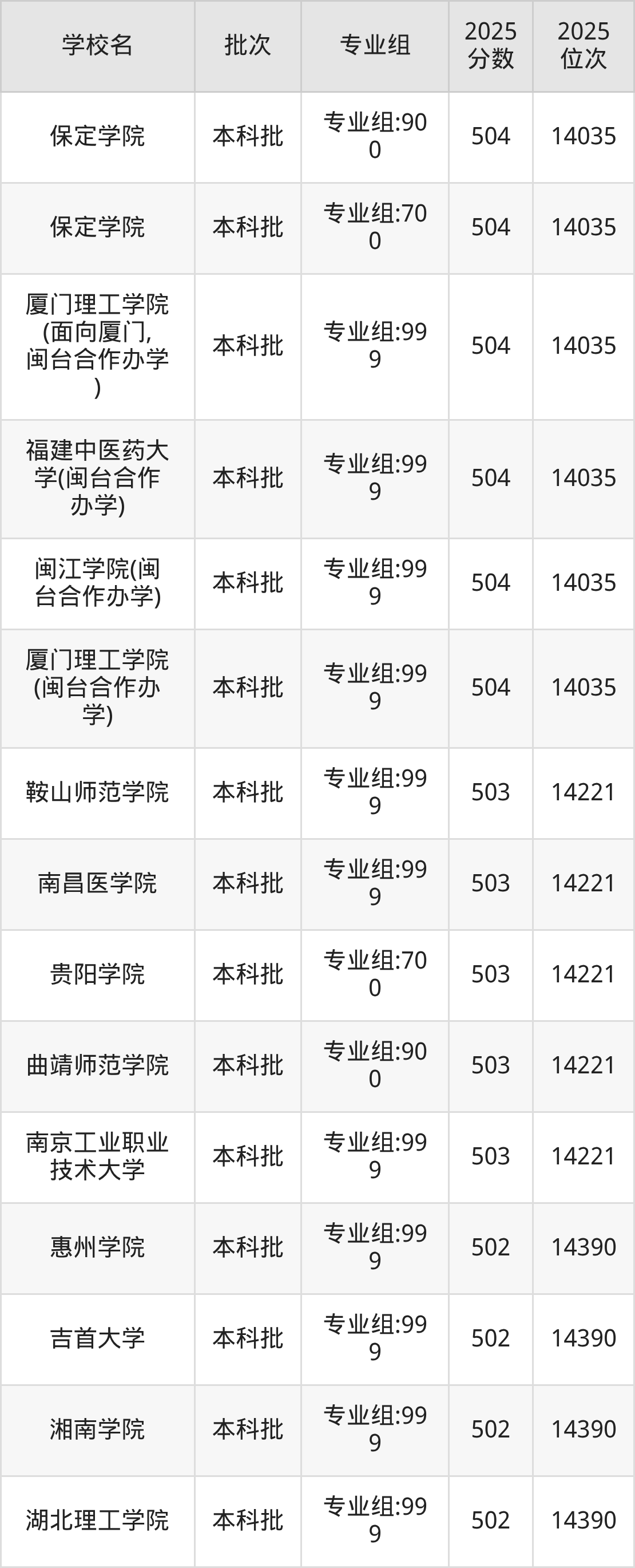2025年福建高考历史类504分(13836名~14035名)能上的大学有福建中医药大学(闽台合作办学)专业组:999、闽江学院(闽台合作办学)专业组:999、莆田学院(面向莆田)专业组:999、厦门理工学院(闽台合作办学)专业组:999等。