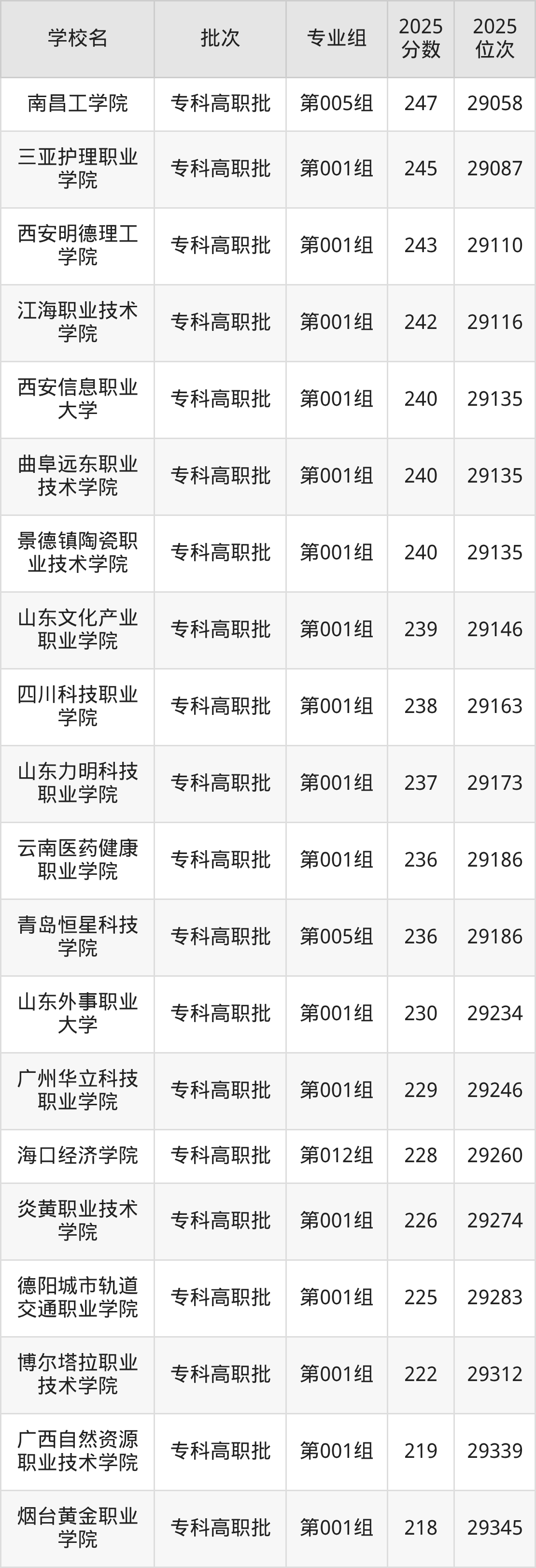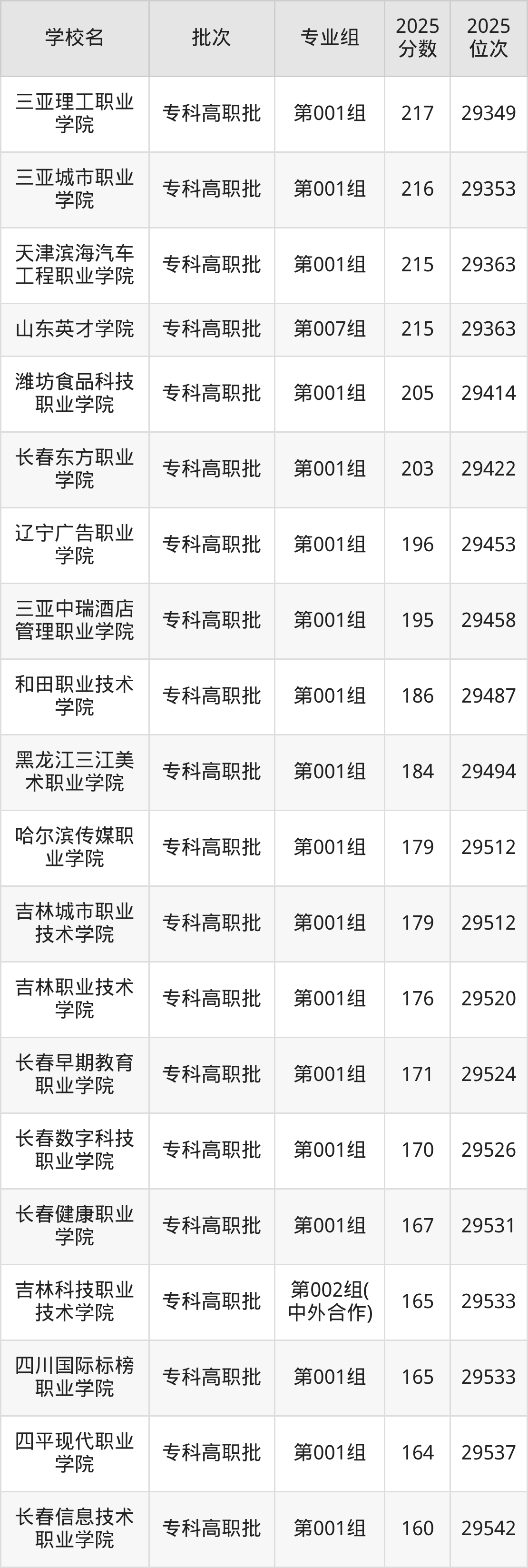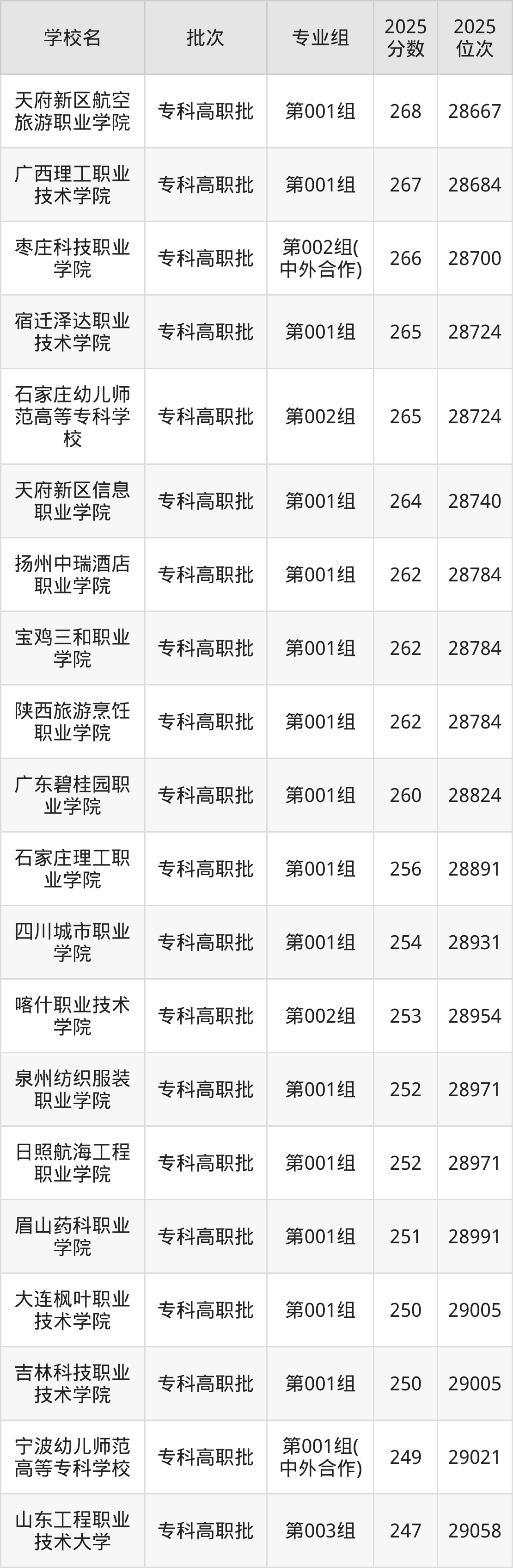 2025年吉林高考历史类244分(29088名~29097名)录取位次低于该区间(较稳妥)的有西安明德理工学院第001组(29110名)、江海职业技术学院第001组(29116名)等;录取位次高于该区间(可冲)的有三亚护理职业学院第001组(29087名)、山东工程职业技术大学第003组(29058名)等。