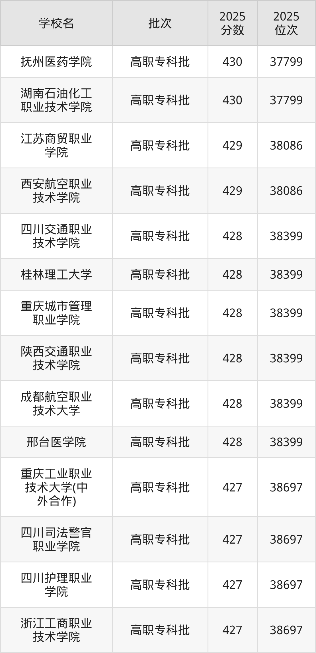 2025年重庆高考历史类428分(38087名~38399名)能上的大学有四川交通职业技术学院、邢台医学院、成都航空职业技术大学、陕西交通职业技术学院等。
