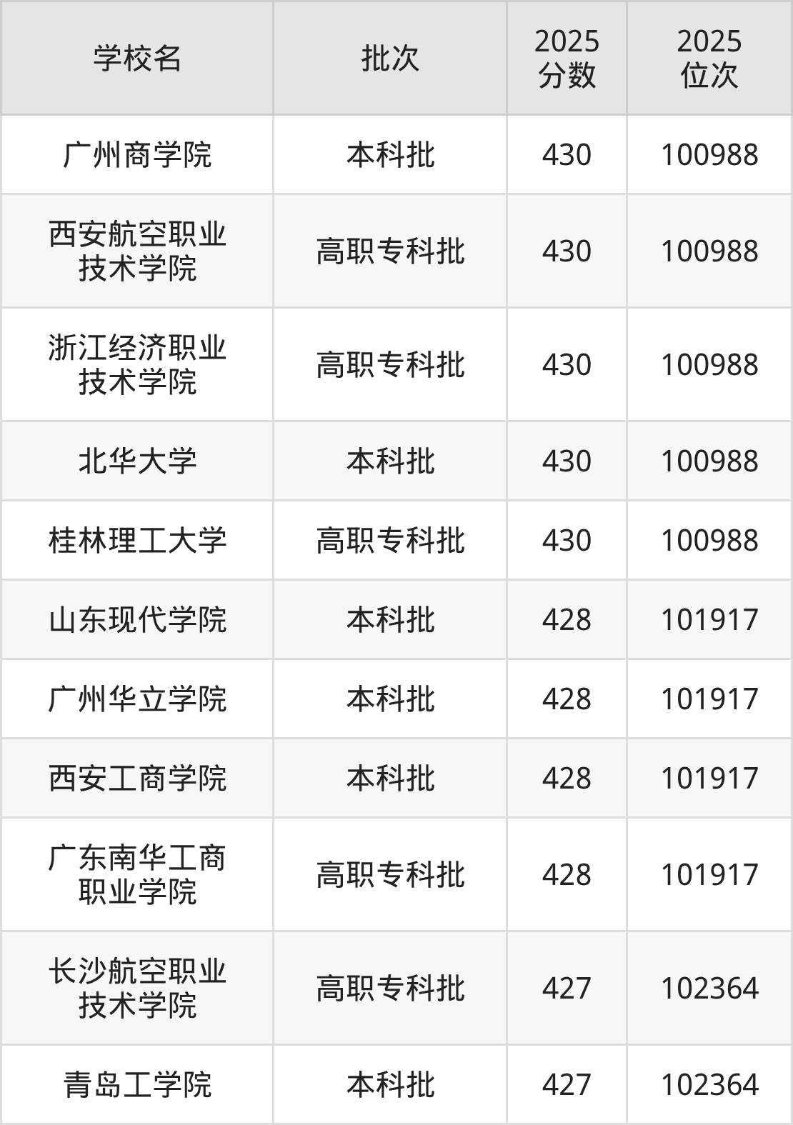 2025年重庆高考物理类428分(101439名~101917名)能上的大学有广东南华工商职业学院、山东现代学院、广州华立学院、西安工商学院。