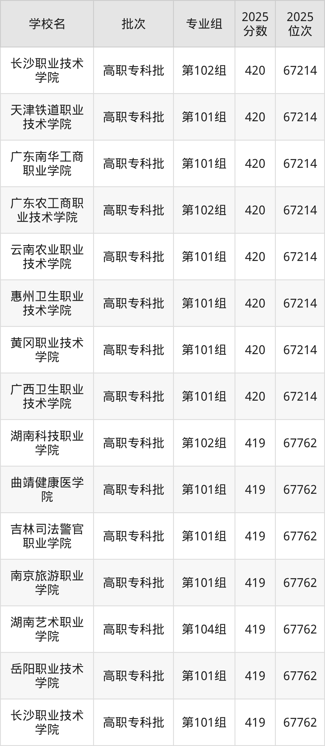 2025年湖南高考历史类419分(67215名~67762名)能上的大学有吉林司法警官职业学院第101组、南京旅游职业学院第101组、湖南科技职业学院第102组、湖南艺术职业学院第104组等。