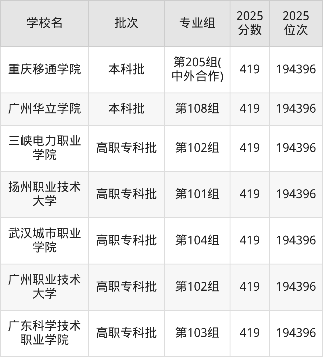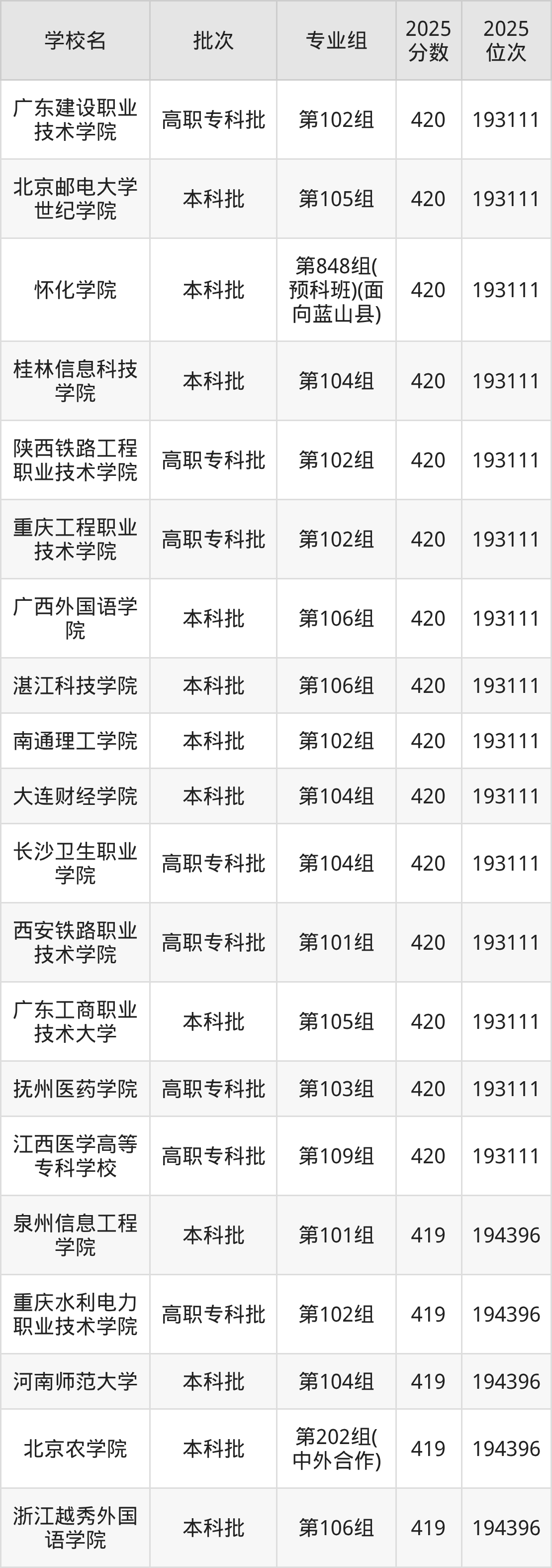 2025年湖南高考物理类419分(193112名~194396名)能上的大学有北京农学院第202组(中外合作)、浙江越秀外国语学院第106组、泉州信息工程学院第101组、河南师范大学第104组等。