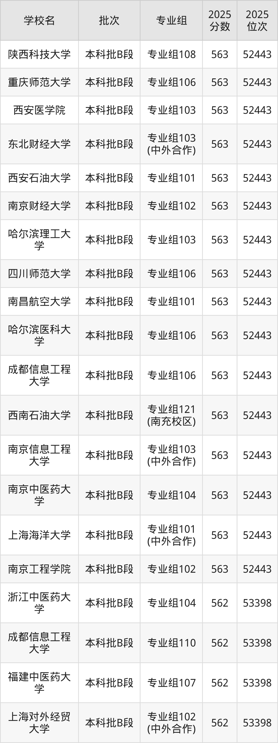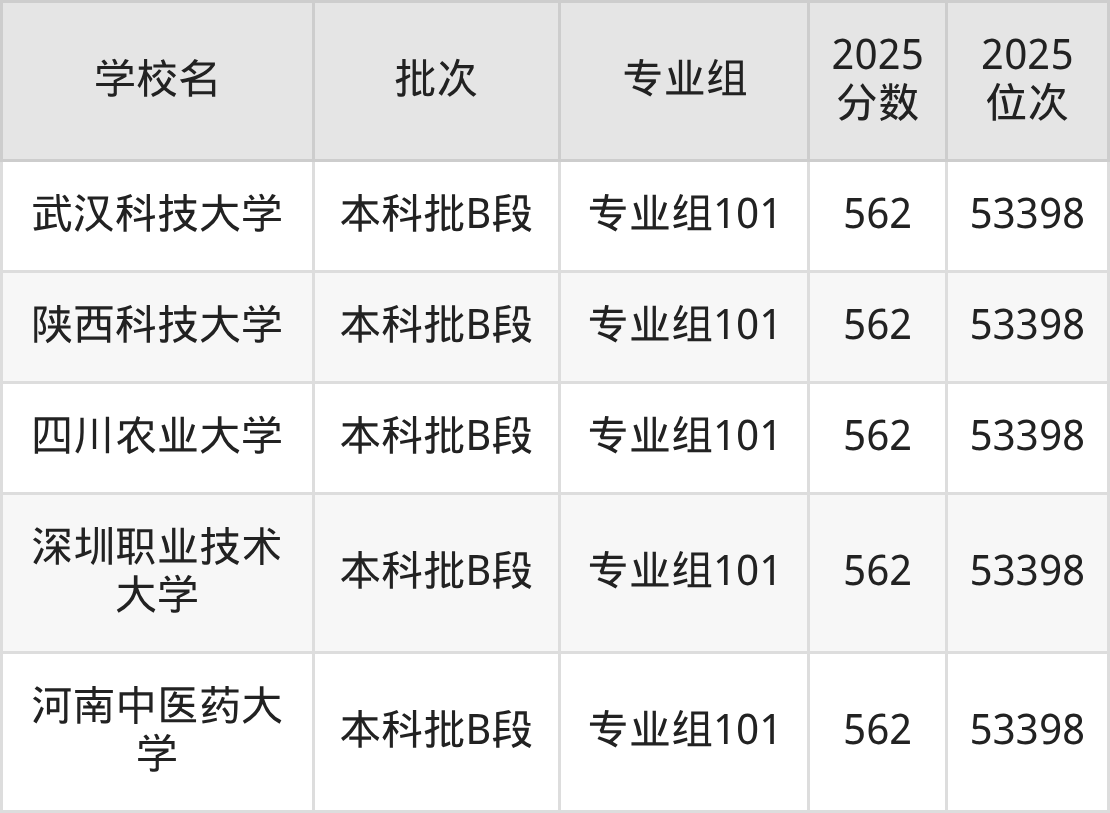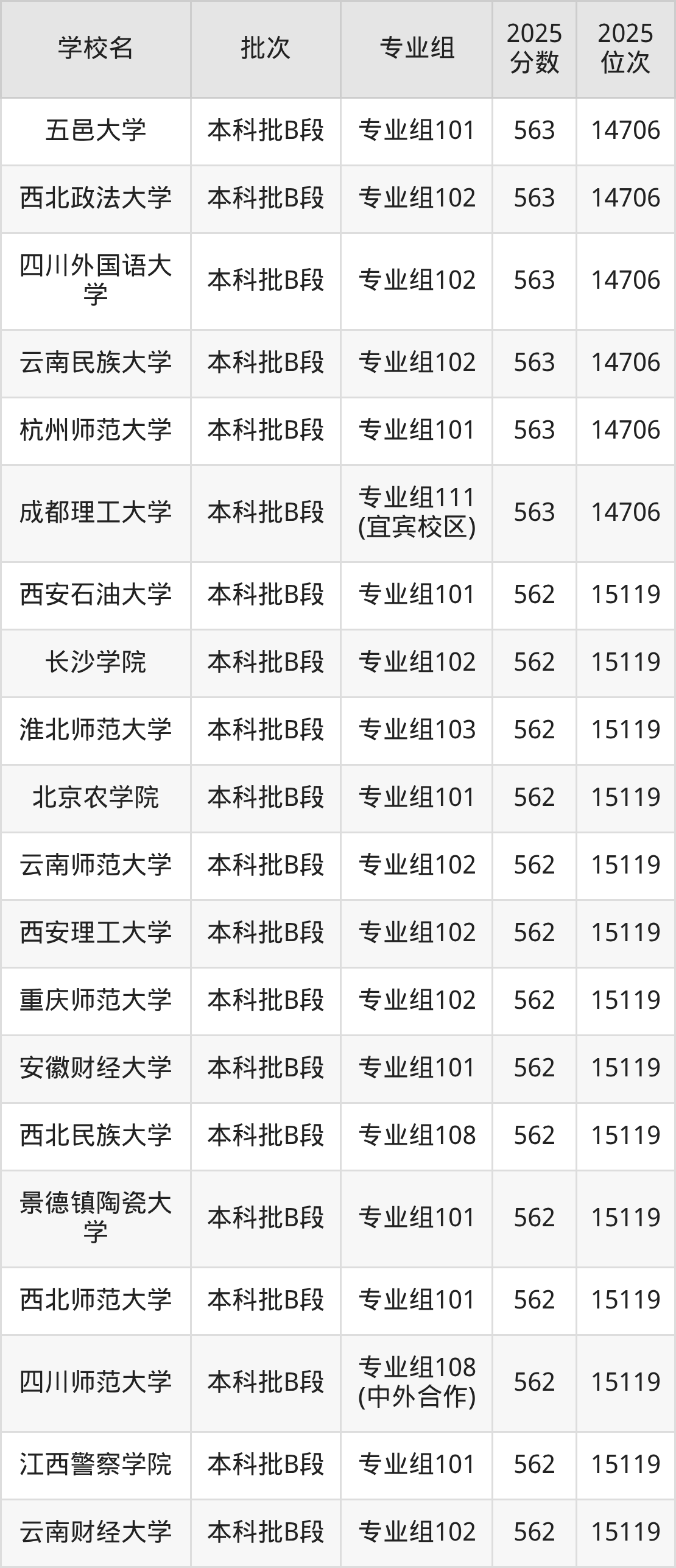 2025年四川高考历史类562分(14707名~15119名)能上的大学有西北民族大学专业组108、北京农学院专业组101、淮北师范大学专业组103、西安理工大学专业组102等。